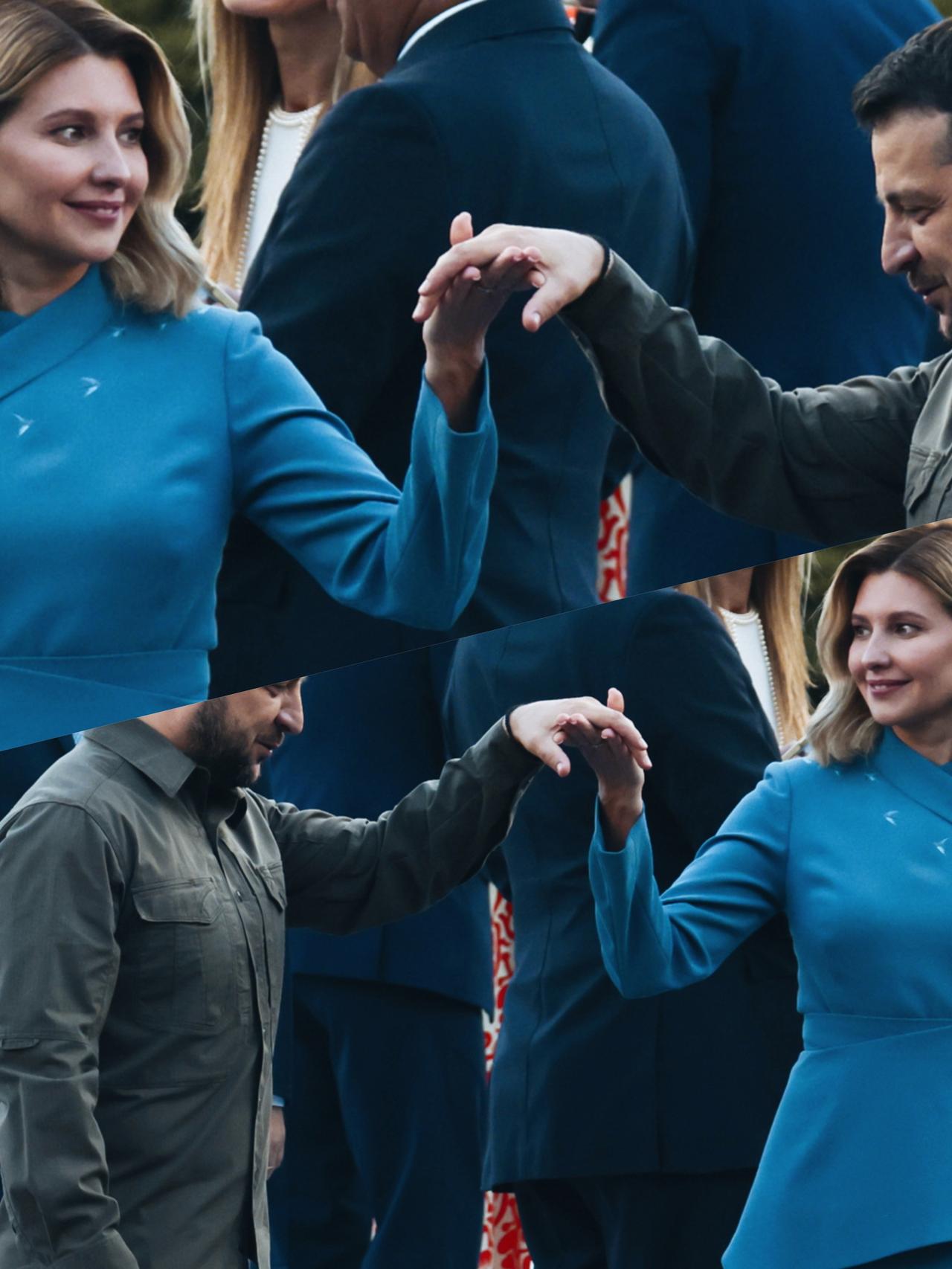 泽连斯基和妻子叶莲娜这是想展示一下双人舞蹈呢?还是在秀恩爱啊? 叶莲娜看向泽连斯