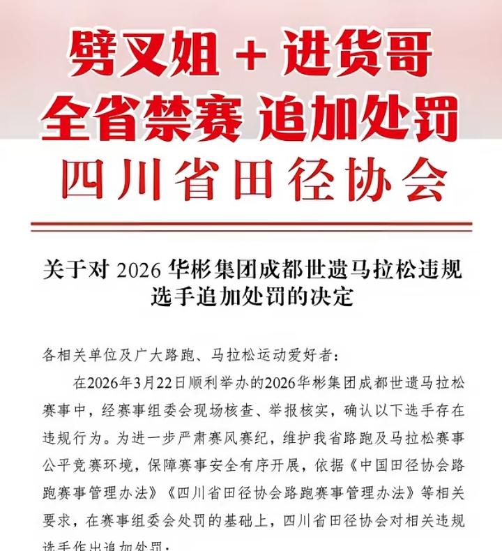 “劈叉姐”被全省禁赛,这也是国内独一无二的禁赛处罚:因为在马拉松比赛过程中随地练劈叉。 要弄清这起处罚的来龙去脉,首先得说说如今马拉松赛事的现状。 随着马拉松运动的普及,参赛的人越来越多,这项原本充满专业性和挑战性的体育赛事,渐渐多了许多娱乐化的元素。 不再是只有专业运动员才会参与,越来越多的普通人加入其中,但很多人参赛的目的并非为了锻炼身体、挑战自我,赛前也从不进行系统锻炼,更多是为了搞怪博眼球、积累社交素材,甚至希望通过一些出格行为一举成名。 在这样的背景下,赛场上出现了越来越多的“显眼包”,“劈叉姐”就是其中最具争议的一个。 她在马拉松圈小有名气,之所以被大家记住,并不是因为比赛成绩,而是因为她独特的参赛方式——每次跑几步,就会突然停下来,在赛道上随地练劈叉,动作滑稽,十分吸引眼球。 起初,不少人觉得这是一种有趣的自我表达,能给紧张的比赛增添几分乐趣,也让马拉松赛事多了些话题度。 除了“劈叉姐”,赛场上还出现了另一位争议人物“打包哥”,同样让人啼笑皆非。 在赛事补给区,“打包哥”背着背包,疯狂打包能量胶,不顾其他参赛选手的需求,行为十分离谱。 其实,无论是“劈叉姐”还是“打包哥”,他们参赛的初衷都不是正常竞赛,更像是来赛场凑热闹,却忽略了赛场的基本规则和他人的权益。 真正让“劈叉姐”被禁赛的,并不是她劈叉的行为本身,而是这种行为带来的严重安全隐患和对赛事秩序的破坏。 马拉松赛道狭窄,参赛人数众多,大家都在有序奔跑,“劈叉姐”突然在赛道中间停下来劈叉,后方的参赛选手毫无防备,只能紧急避让,稍有分心,就可能发生碰撞、摔倒,甚至引发连环踩踏事故,后果不堪设想。 她的行为,不仅影响了其他选手的正常比赛节奏,更将他人的安全当成了儿戏。 更值得一提的是,“劈叉姐”的这种行为并非偶然,而是她参赛时的常态,长期以来,这种行为已经对赛事秩序造成了不良影响。 最终,相关部门做出了全省禁赛两年的处罚,这一处罚在国内独一无二,也是国内首个因劈叉行为被禁赛的案例。 “劈叉姐”恐怕也没有想到,自己一时兴起的搞怪行为,不仅让自己遭到禁赛,还成了全国范围内的负面典型,给自己留下了难以抹去的污点。 其实,马拉松赛事从来都不排斥娱乐和自我表达,适当的搞怪行为确实能提升赛事的趣味性和关注度,让更多人了解和喜欢上这项运动。 但娱乐必须有边界,自我表达不能凌驾于他人安全和赛事规则之上。 “劈叉姐”被全省禁赛,这也是国内独一无二的禁赛处罚:因为在马拉松比赛过程中随地练劈叉。 这份处罚一点都不冤枉,它给所有参赛选手敲响了警钟,无论出于什么目的参赛,都要坚守底线,不能因为自己的一时兴起,影响他人、危害安全。 如今,“劈叉姐”禁赛事件已经引发了广泛的社会讨论,越来越多的人意识到,马拉松首先是一场“赛”,其次才是一场“秀”。 赛道可以包容不同的热爱和表达,但绝不能包容自私和危险。 像“劈叉姐”这样不顾他人安危的行为,理应受到处罚,也希望各地赛事主办方能够效仿这一做法,对违规行为严格监管,拉黑此类不顾规则的参赛选手,守护好马拉松赛场的秩序,让这项运动回归本质,真正传递健康、向上的体育精神。 希望所有参赛选手都能引以为戒,尊重赛事、尊重他人、尊重自己,在享受运动乐趣的同时,自觉遵守赛事规则,共同维护一个安全、有序、公平的赛场环境,让马拉松运动能够健康、长久地发展下去。 如果各位看官老爷们已经选择阅读了此文,麻烦您点一下关注,既方便您进行讨论和分享,又能给带来不一样的参与感,感谢各位看官老爷们的支持!