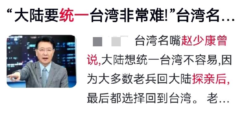 赵少康说统一很难,真相不止老兵那代人的选择 赵少康曾以老兵探亲后仍返台为例,直言大陆统一台湾并非易事,这番话点出了两岸关系的现实痛点。 当年赴台老兵魂牵梦萦故土,回乡后却多选择返台,并非不念根,而是故乡面貌巨变、亲人疏离,心理落差巨大。他们在台湾成家立业,生活、医疗、亲情早已扎根,故土是情怀,台湾是现实,两难之下只能回归日常。 这一现象也折射出统一的深层难题:两岸数十年分隔,不仅是地理距离,更是认知与情感的隔阂。老辈尚有家国记忆,年轻一代受岛内舆论与教育影响,对大陆缺乏真实了解,加之外部势力与台独势力操弄对立,人心凝聚难度倍增。 但统一大势不可逆转,两岸同根同源是铁一般的事实。大陆始终以诚意推动交流,越来越多台湾青年走进大陆、认清真实。路虽远,行则将至,形式统一易,人心统一难,而历史终将走向圆满。 对此,你有何认知度? 两岸统一 台海局势 赵少康 两岸人心