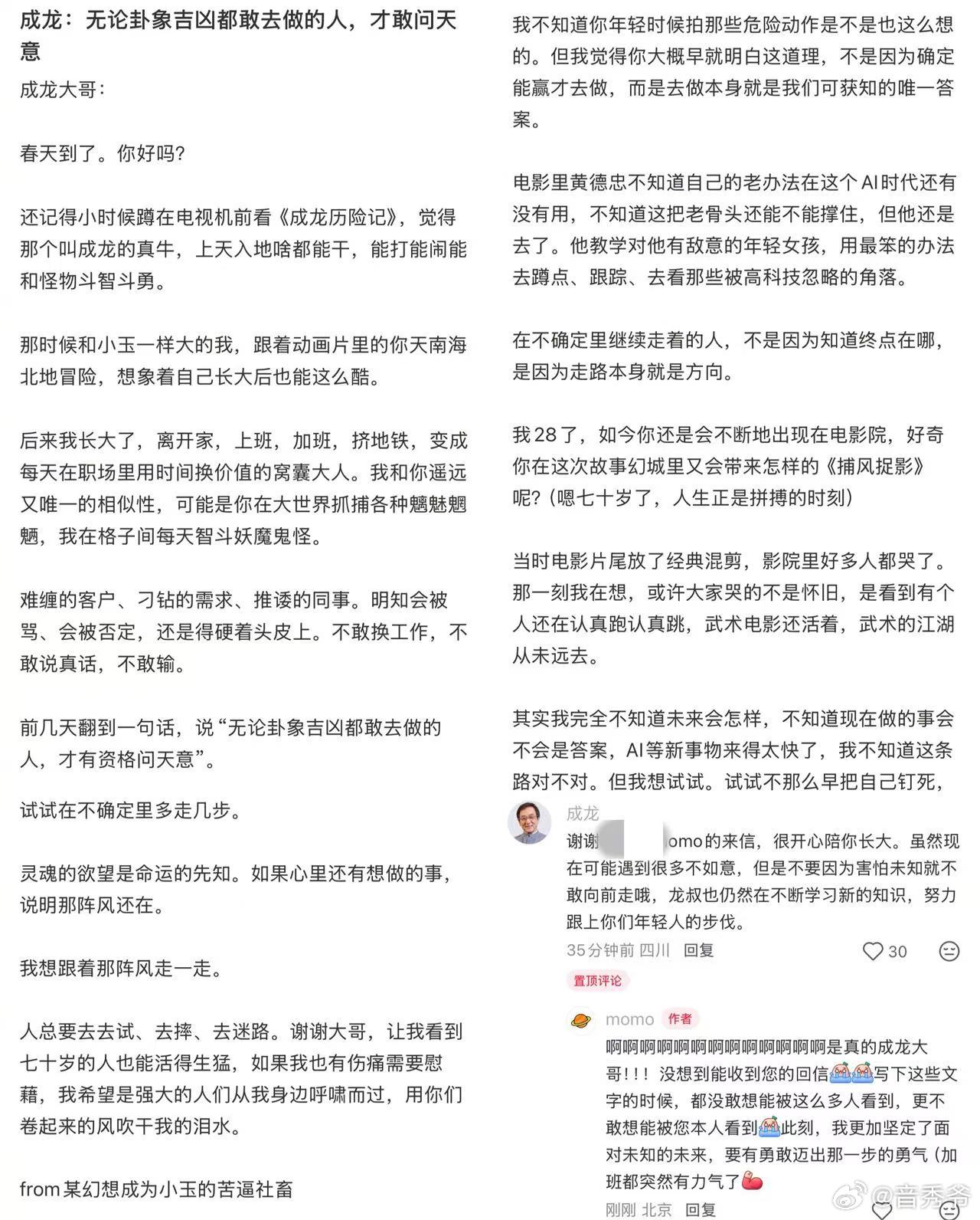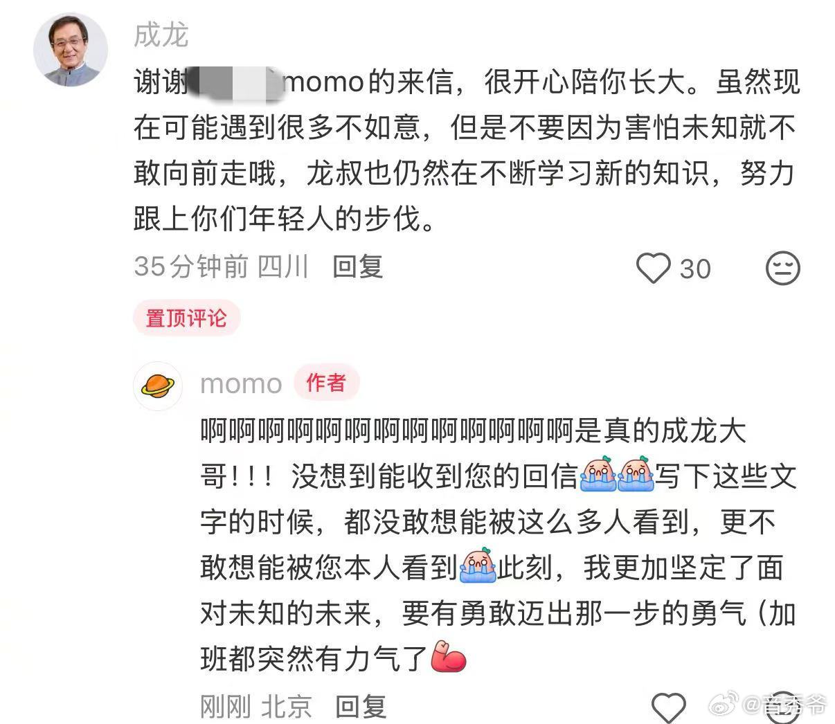 原来给成龙写信真的会被回复成龙给10年剧粉写信了 老一辈艺人的温柔真的太戳人,成龙大哥认真回复粉丝来信,对迷茫的年轻人温柔鼓励,对有家庭困惑的粉丝贴心开导,这份双向奔赴让人心里暖暖的,银幕上是传奇,生活里是温柔前辈。