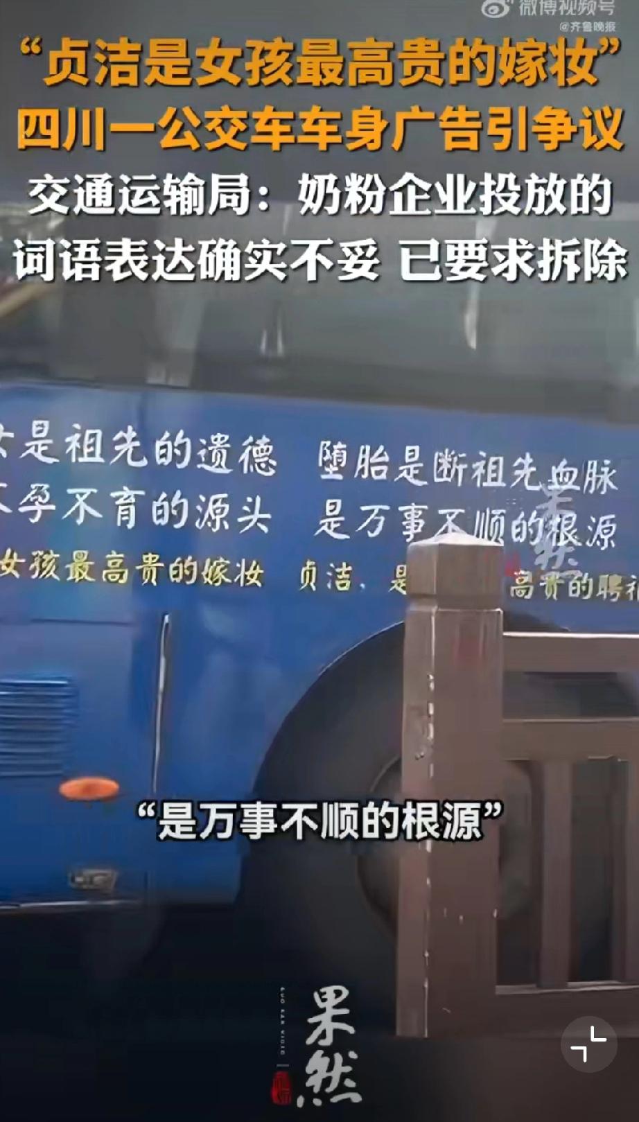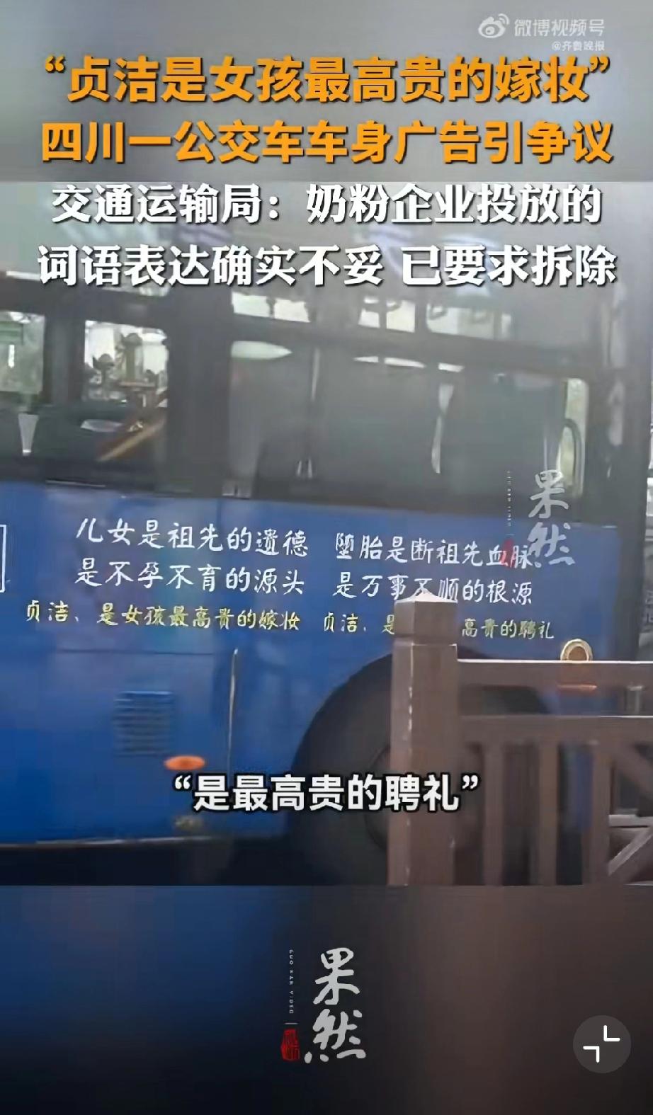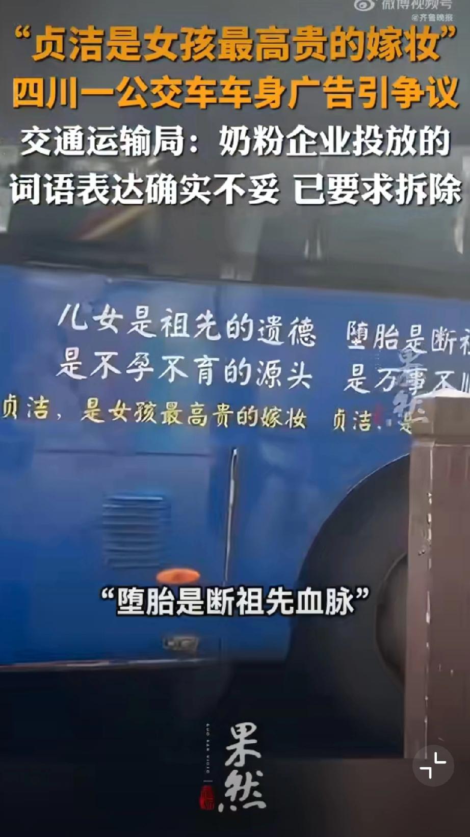 公交车贴“贞洁嫁妆”标语?封建糟粕别在现代社会招魂! 四川乐山这公交车广告真是让人看了火大!“贞洁是女孩最高贵的嫁妆”“堕胎断血脉”——这哪是广告,简直是封建糟粕的“移动贞节牌坊”,在现代社会里瞎晃悠! 都2026年了,居然还有人把女性价值绑在“贞洁”上,把堕胎污名化成“断血脉”——这既不懂法,也没公德!《广告法》明确规定,广告内容得符合社会公德,不能含有歧视、侮辱性内容。这种拿封建礼教物化女性的标语,早该被扔进垃圾桶! 女性的高贵,从不是什么“贞洁嫁妆”,而是独立的人格、自由的灵魂、闪光的才华;堕胎是复杂的医学和社会问题,绝不是可以被粗暴诅咒的“罪孽”。 这种广告能堂而皇之贴在公交车上,不仅是对女性的冒犯,更是对现代文明的挑衅!公交标语 女司机标语 婚车横幅