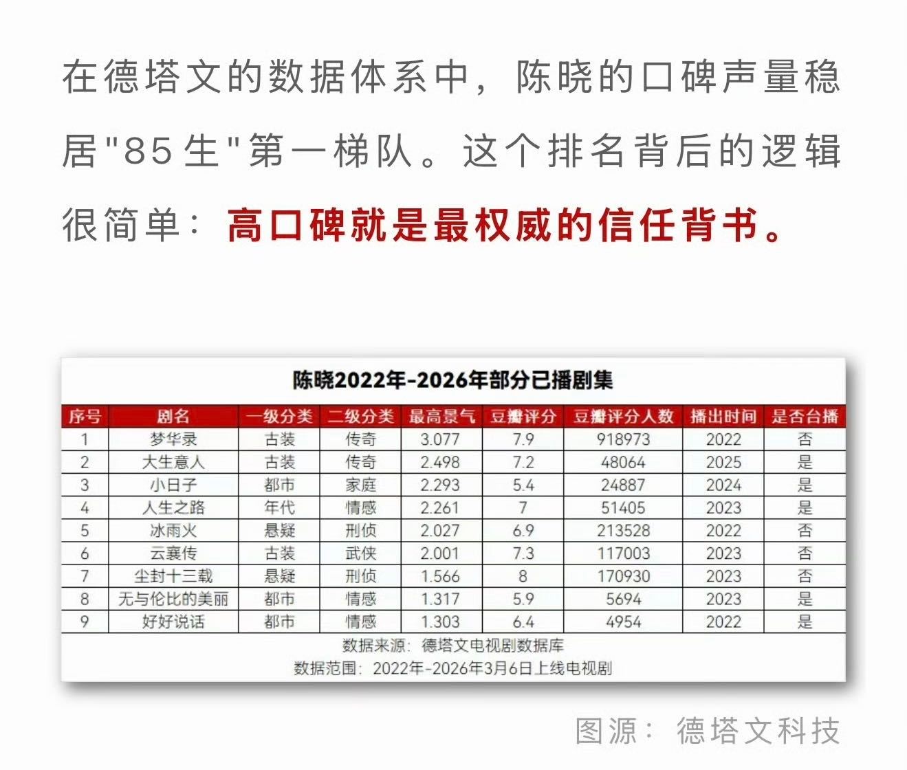 85后头部品质演员,这头衔陈晓 应该无庸置疑了吧?从古偶到正剧,从古装到现代,都能轻松驾驭,全赛道制霸受众面广,各年龄层各人群全覆盖,观众缘极好“既能代表品味,又能保持亲民”的气质,在他身上绝对是独一份的,属于稀缺的全能品质演员,谁看了不想希望哥多来点好资源好角色,拍更多精彩好剧造福我们观众啊!