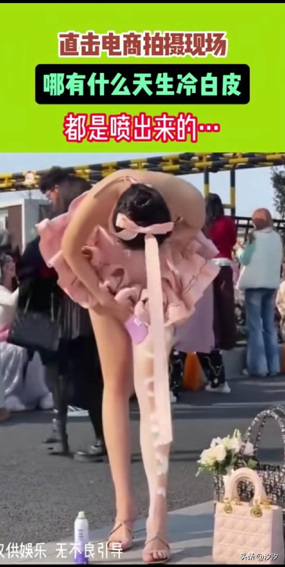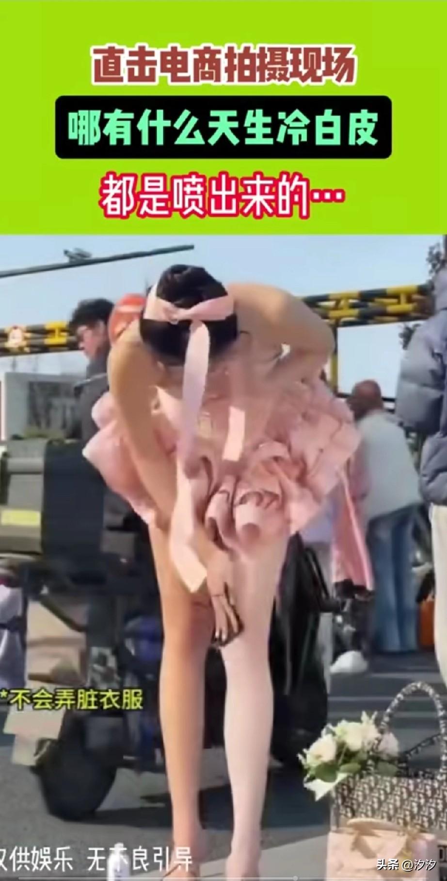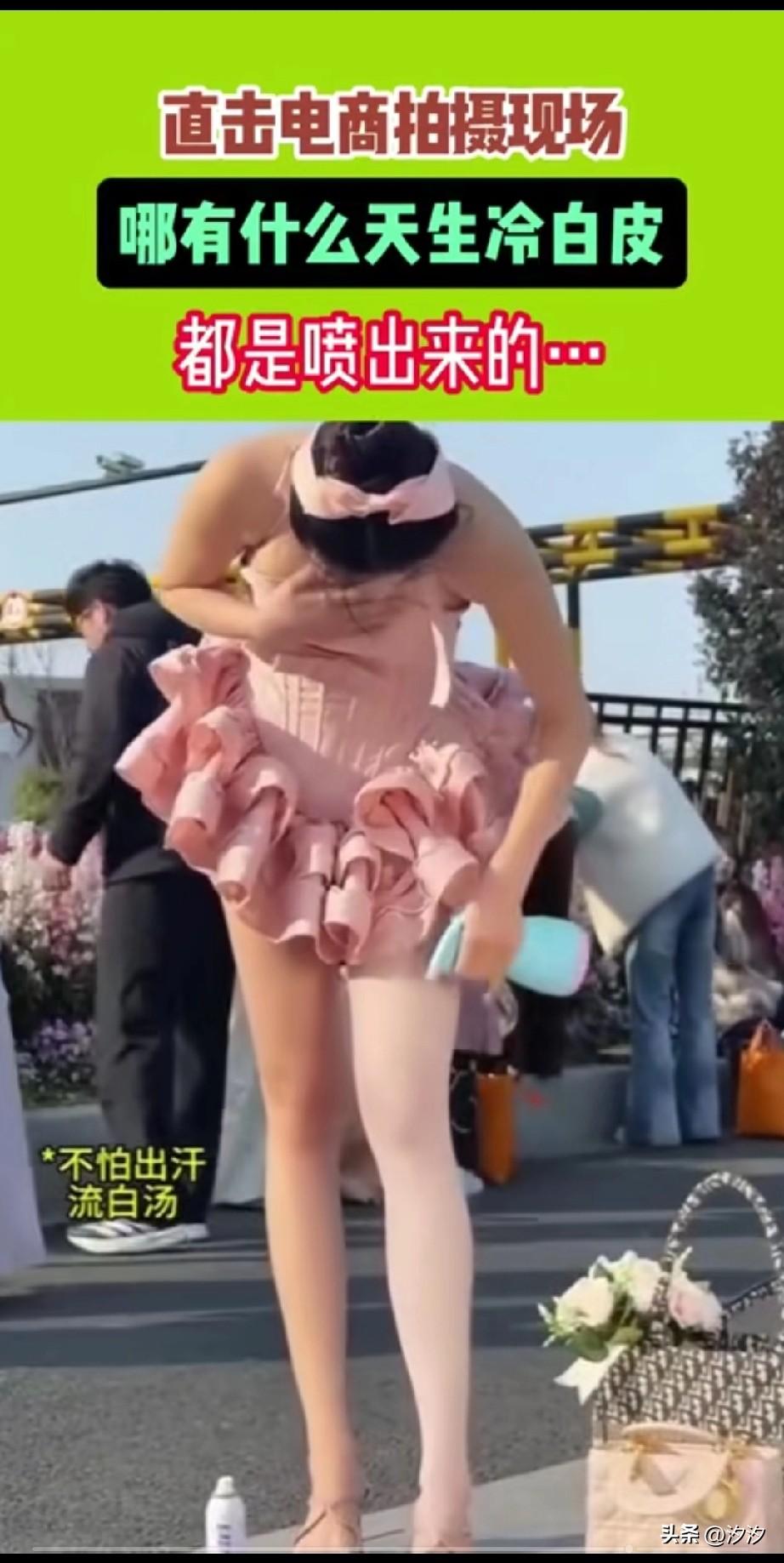 电商拍摄现场, 直接出现了这一幕, 只见一名皮肤发黄的女生, 拿着一罐白色的漆, 直接往自己的腿上一喷, 随后将其抹匀, 一条洁白的美腿就出现了, 随后她还拿纸擦了擦, 然后又用抹布打磨了一下, 最后喷了喷水, 水都直接流了下来, 有网友称这是冷皮肤, 殊不知人家直接是涂层, 现在的直播带货, 上面的美女又有几个是真的? 怪不得那么多白富美, 全都是包装出来的, 也不知道天天看直播买东西的人, 都是怎么想的? 大家对于这样的直播美女怎么看? 电商自拍 电商女装拍照 皮肤特写 皮肤色调辨别