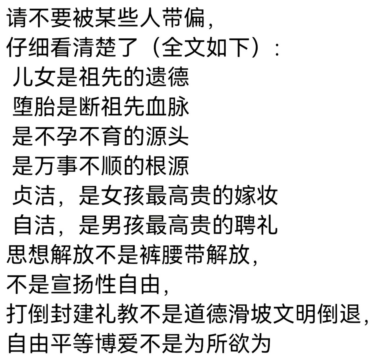 男女的贞操和自爱都是封建的糟粕?现在相亲要求是处女身,就说男的变态,四川公交那句倡导男女都守分寸、懂自爱的标语,刚出来就被一群人急着否定。 这场舆论吵来吵去的核心,是很多人把两个完全不搭边的概念硬绑在了一起。封建贞操观的本质,是男权社会对女性的单方面人身束缚,把女性的身体当成男性的私有财产,这才是真正该丢的糟粕。 大家反感相亲里非要要求女方是处女的行为,本质反感的是双标。2025年国内主流婚恋平台的调研数据显示,超62%的受访者抵触的,是要求女性守贞、自己却毫无约束的双重标准,不是对忠诚和自爱的正常诉求。 四川公交引发争议的那句标语,完整内容是倡导男女都守分寸、懂自爱、拒低俗,核心就是公序良俗的正向引导,既没针对单一性别,也没提封建贞操的要求,完全是被断章取义贴上了糟粕的标签。 封建贞操观的糟粕性,是有明确历史佐证的。明清时期盛行的贞节牌坊,要求女性丧夫后终身守寡、甚至殉节,完全剥夺了女性的婚恋自由和身体自主权,这种把人物化的规训,和现代说的自爱根本不是一回事。 现代语境里的自爱,核心是自我尊重和责任担当,是不分性别的双向要求。它既包括对自己身体和情感的负责,也包括对婚恋关系的忠诚,是个人修养的体现,和封建糟粕完全沾不上边。 中国社会科学院2024年发布的全国青年婚恋观调查报告显示,超78%的年轻受访者认同“婚恋中男女都应保持自爱与忠诚”,只有11%的受访者觉得所有关于自爱的倡导,都属于封建糟粕。 现在很多人的舆论误区,是把反对封建贞操、追求性别平等,极端成了反对一切自我约束。甚至把自爱当成贬义词,把毫无底线的放纵当成了自由,完全偏离了性别平等的初衷。 真正的性别平等,从来不是否定自爱,而是要求男女拥有同等的身体自主权,和同等的道德约束标准。既不搞针对女性的单方面贞操绑架,也不否定个人对自我修养的合理要求。 糟粕从来不是自爱本身,而是单方面的束缚、双标的要求和把人物化的畸形规训。我们要摒弃的,是把女性身体当作附属品的封建糟粕,而不是男女都该有的自我尊重与责任担当。真正的自由,从来不是毫无底线的放纵,而是在尊重自己、也尊重他人的前提下,做出对自己人生负责的选择。男女地位不平等 贞操不可逆 女生准则
