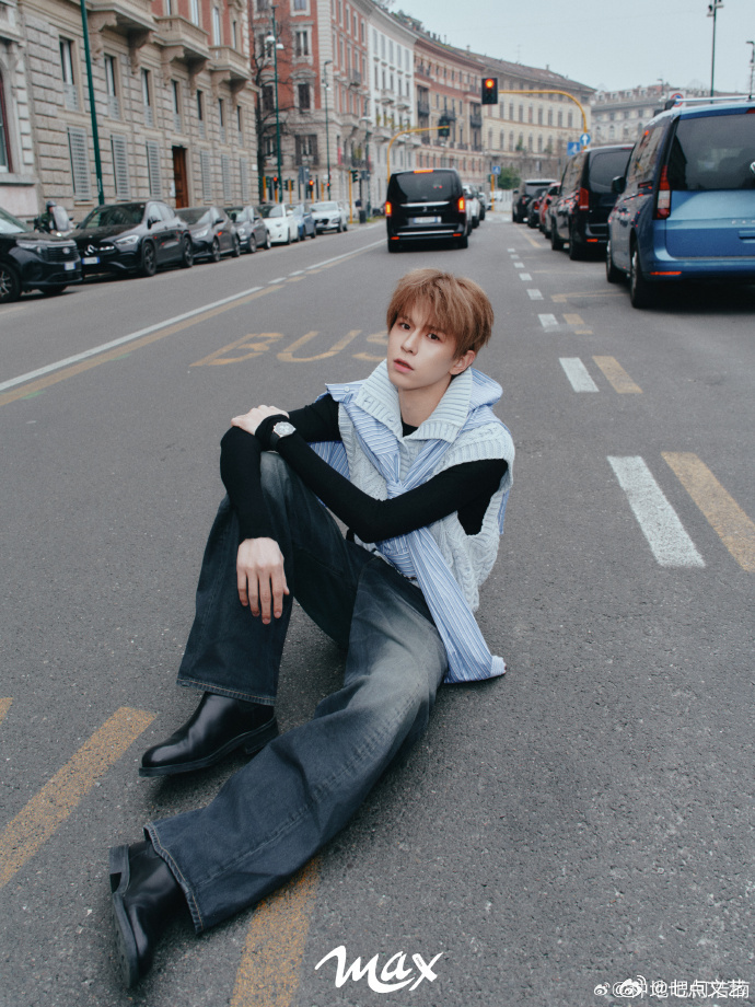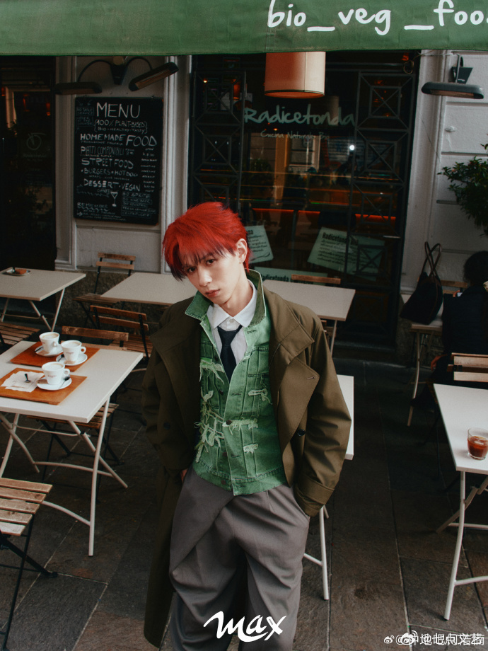 何浩楠意式街拍大片 蹲在湖边托腮,全黑西装衬得红发耀眼,意式水岸风光里,冷感与热烈感碰撞出独特魅力何浩楠红发挑染