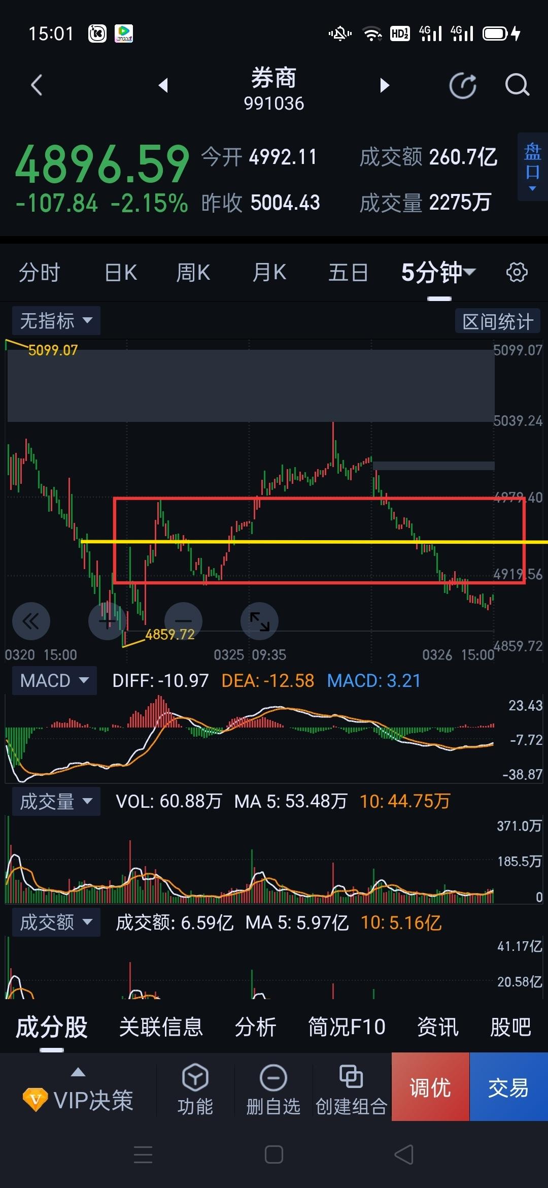 券商板块,明天多头会有一定的防守动作。 券商盘中快速跌穿昨天的强弱分水岭4975(图1),全天被空头持续碾压,并未形成象样抵抗。明天多头应该会利用4859低点的支撑,组织适当的反击。 明天券商走势可归纳为三种: 一,如快速跌破4859,要防止反抽形成图(2)中枢的三卖。 二,在4859上方获得支撑,反抽不接触图(2)中枢的半分位,后市仍有下破4859的风险。 三,在4859上方获得支撑,反抽站上图(2)中枢半分位,可暂当该中枢的震荡延伸观察。 券商要想参与,为求稳妥可等三十分钟呈现右侧买点,再择机入场。