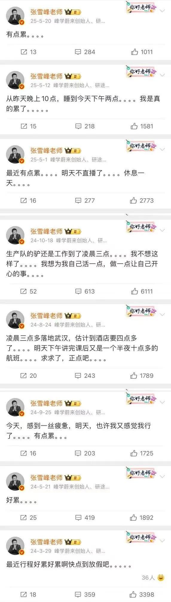 张雪峰曾经在直播间里毫不忌讳的谈论自己的生死,他想跟那些大教育家一样,名垂青史成为人们口中谈资。 他说:如果有一天我死了,各个大平台都会有个热搜,叫“张雪峰”死了,他可能会成为一代人的回忆,十几届学生的回忆,就像大家回忆刘德华张学友那样,那是一代人的回忆。挣多少钱对我来说已经不重要了,能够帮助大家这个是重要的。 我想,他应该是做到了。 他的离世上了各大平台的热搜,成了头条榜首,成了各大院校、社会各界悼念的对象。 人们悼念他是因为他出身寒门,不仅通过自己努力逆天改命,还帮助普通学子们避开“天坑”专业逆天改命,打破了教育信息茧房。作为成功人士的他没有忘本,积极反馈母校,助学贫困生践行教育理想。 翻看他这两年发的动态,只有一个字概括,那就是“累”。 他定下的上三休四制度,员工休息时,他一天不休。一天几场直播,还要每天固定凌晨0-4点回复私信。一年200多天住酒店,一天只睡三四个小时,就连机器也会磨损坏的。 最要命的是,一天7公里长跑,一个月72公里的长跑,加上不良的饮食习惯,早就把身体透支了。 留下上亿的资产,狠心抛下妻女父母,撒手而去了。 人真的有时候不能这么拼,该休息的时候要休息,休息好了才能更好的去工作。 不让别人卷,自己比任何人都卷,身负责任,心系寒门学子,他只是累了该休息休息了。