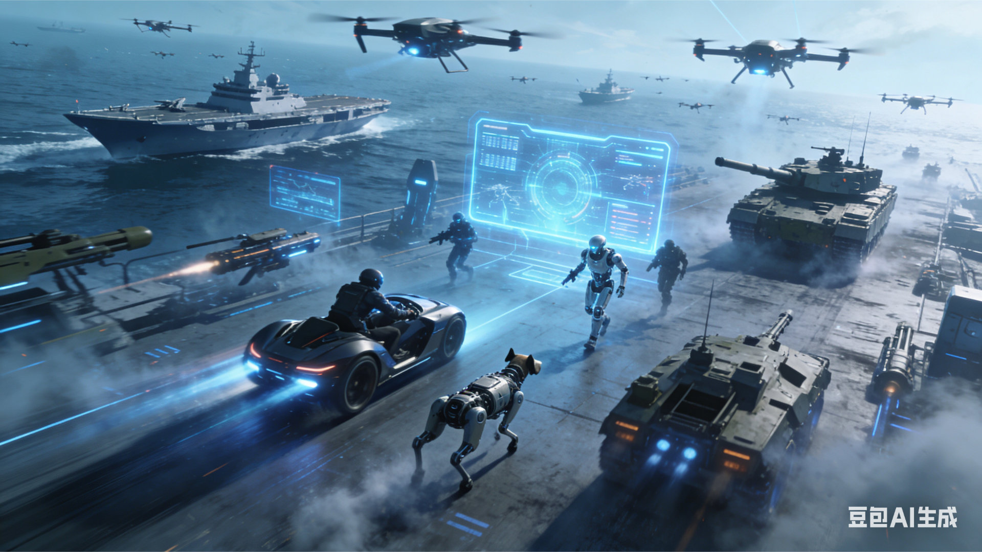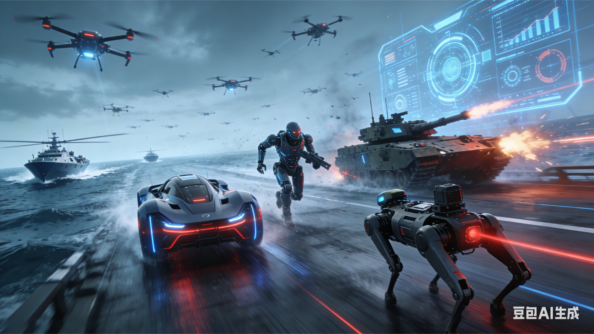 俄乌战场惊现持枪人形机器人 未来的战争,一定是高科技战争。无人驾驶电动车+机器狗+人形机器人+无人机+无人舰+无人坦克+AI等形成智能作战体系,大有可为。(图片由豆包生成)