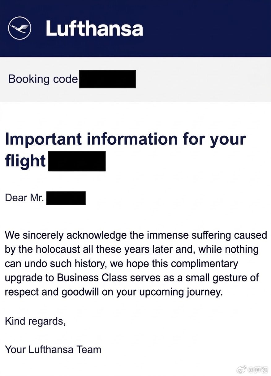 一名欧洲旅客在预定德国汉莎航空机票时,意外发现,当他将VPN设置为以色列、备注自己是犹太人后,汉莎航空免费给他升舱到了商务舱,因为时隔多年他们依旧对大屠杀给犹太人带来的苦难感到抱歉。看看二战之后犹太人对德国纳粹的清算,再看看中国人对日本的宽容,换来了什么?