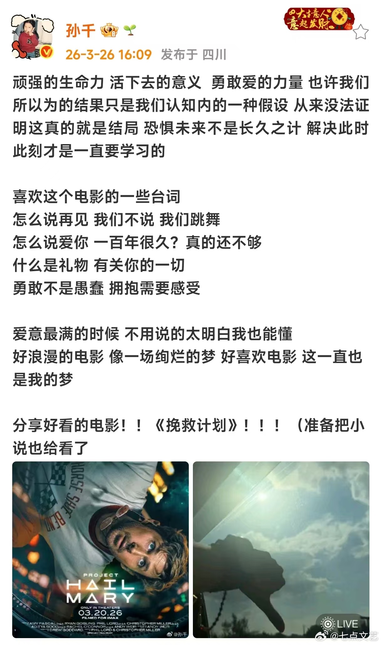 孙千挽救计划给到夯 孙千的观影分享太戳心挽救计划里的跨物种友谊太动人每一个坚守的瞬间都在诉说生命的美好太有温度 孙千分享挽救计划