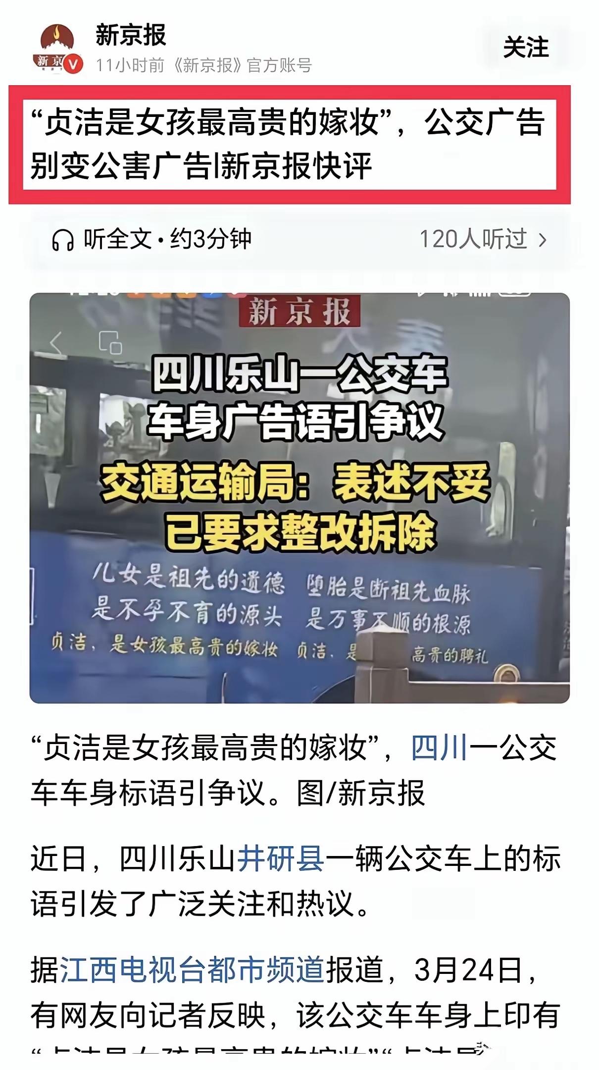 宣传贞洁自律就是公害广告、流动糟粕?某些媒体的双标真让人看不懂。 乐山公交这条男女双向倡导洁身自爱的标语,明明是劝人对感情与家庭负责,却被刻意裁剪、歪曲成压迫女性的枷锁,被扣上各种帽子博流量。 普通父母都盼着子女守住底线、爱惜自己,这本是朴素的公序良俗,不该被贴上封建标签。 真正该反思的,是那些故意割裂男女、制造对立,消解正向价值观的媒体,手握话语权却不担责任,才是公共空间的隐患。 自律自爱本无错,你支持理性倡导贞洁观念吗?