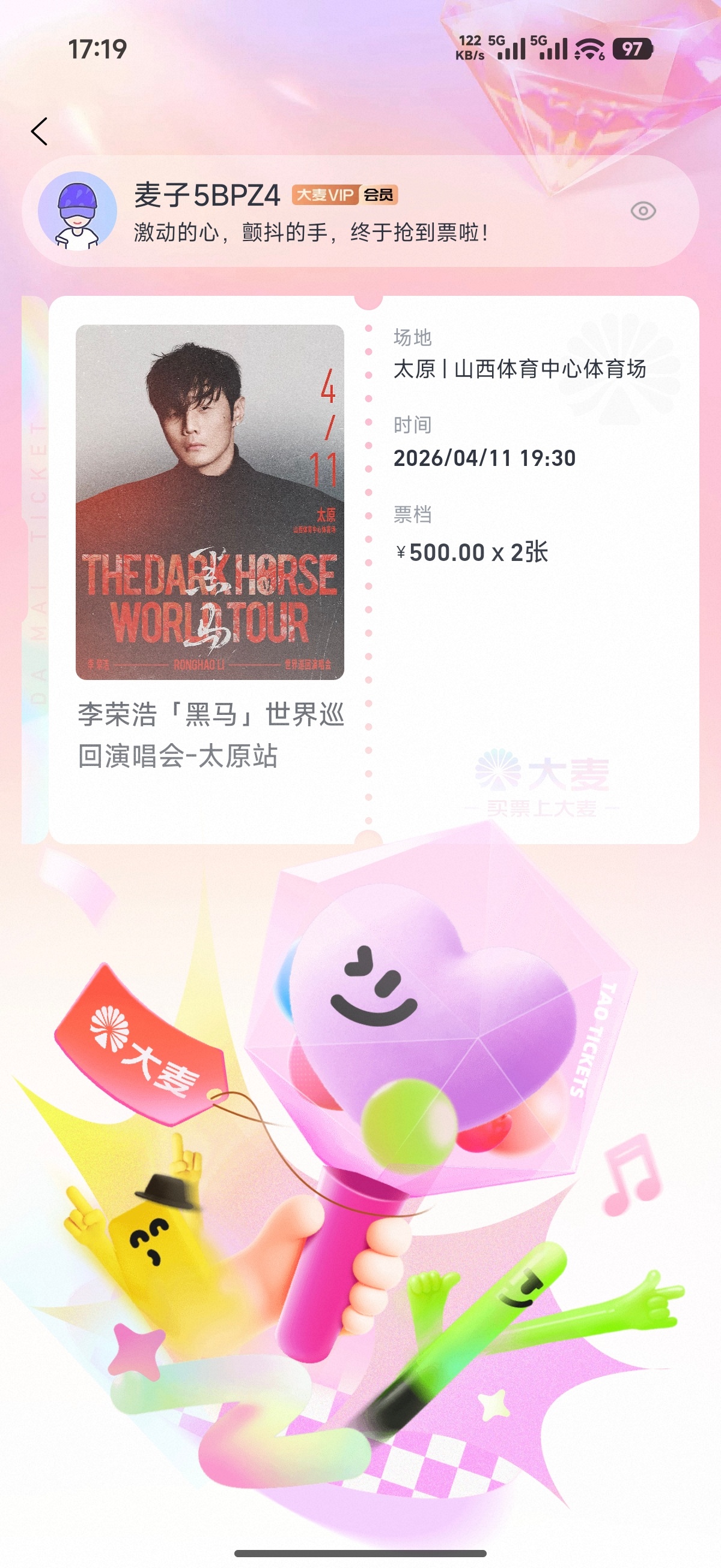 卧槽,今天抢了两个演唱会门票都抢到了,以前抢连座从来没抢到过,下个月去山西看薛之谦和李荣浩啦
