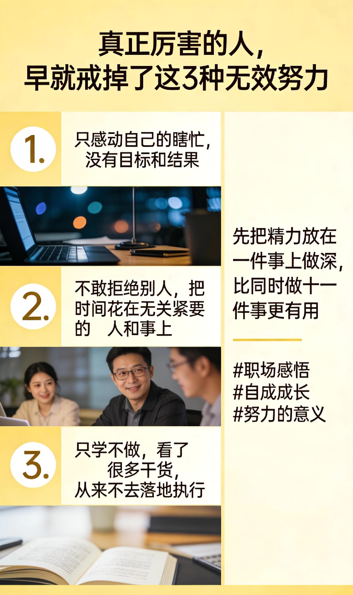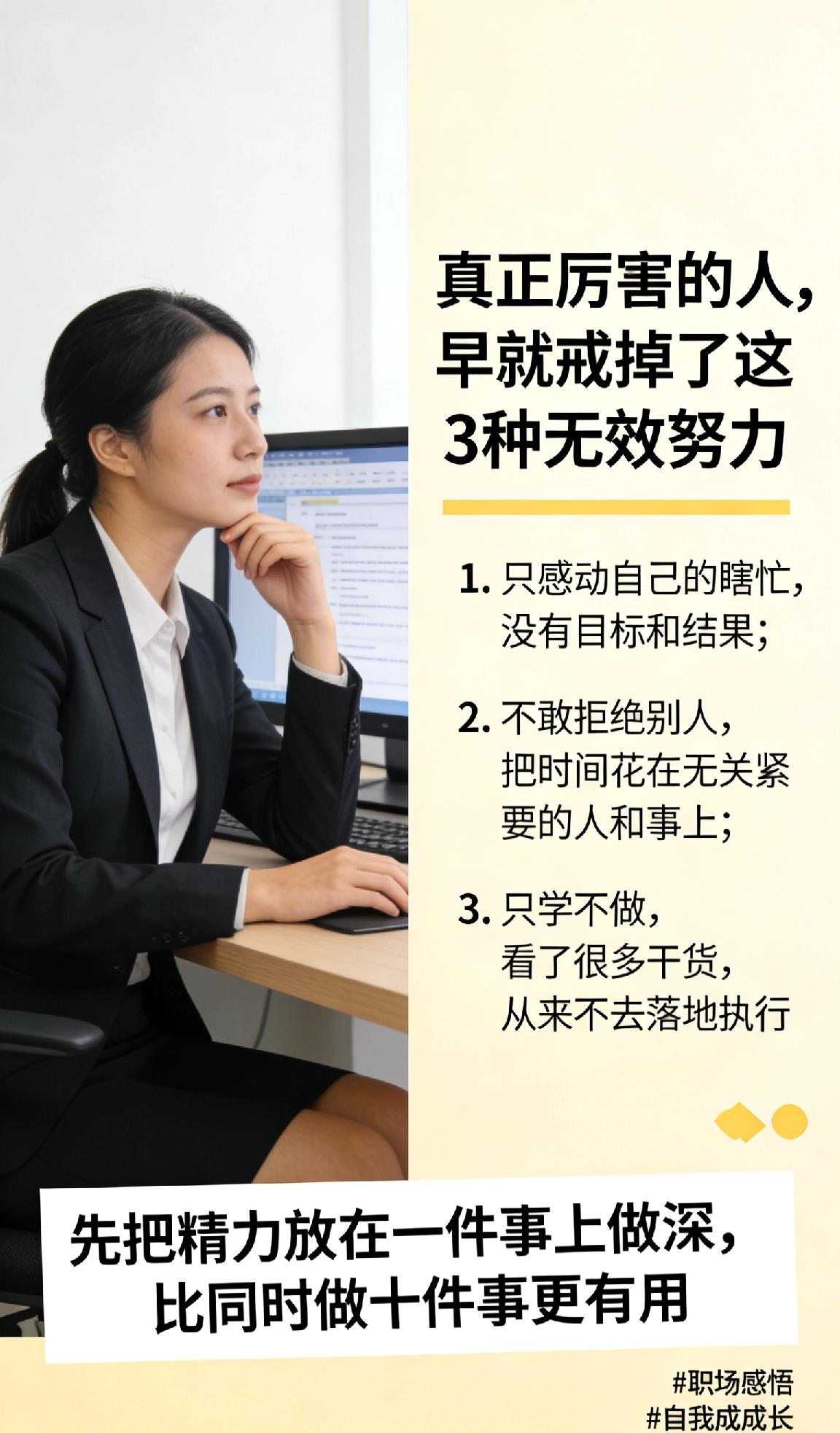 真正厉害的人,早就戒掉了这3种无效努力 很多人每天忙到深夜,却越忙越迷茫,其实是在做无效努力。 建议戒掉这三点: 1. 只感动自己的瞎忙,没有目标和结果; 2. 不敢拒绝别人,把时间花在无关紧要的人和事上; 3. 只学不做,看了很多干货,从来不去落地执行。 先把精力放在一件事上做深,比同时做十件事更有用。 职场感悟 自我成长