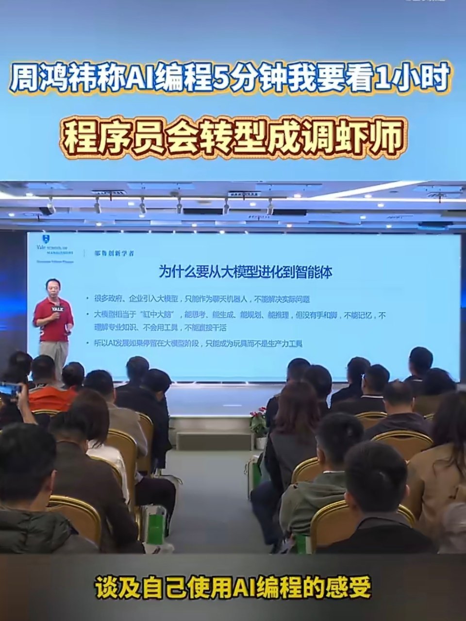 周鸿祎称AI编程5分钟我要看1小时周鸿祎称程序员会转型成调虾师AI的优缺点都很明显啊,写代码五分钟一千行,顶级程序员也望尘莫及。可惜漏洞比速度更惊人,知错,认错,就是不改错。要鱼和熊掌兼得的话,只能是程序员转型“调虾师”,AI负责速度,人负责兜底,才能又快又稳。