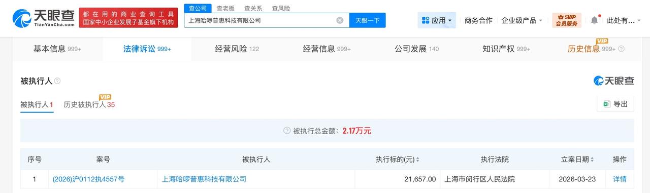 哈啰出行被执行2万 遭315点名的哈啰出行被执行2万 天眼查法律诉讼信息显示,近日,上海哈啰普惠科技有限公司新增一则被执行人信息,执行标的2万余元,执行法院为上海市闵行区人民法院。 上海哈啰普惠科技有限公司成立于2016年3月,法定代表人为吴晓龙,注册资本44亿人民币,经营范围含机械设备租赁、共享自行车服务、小微型客车租赁经营服务、物联网应用服务、物联网技术服务、信息系统集成服务等。股东信息显示,该公司由江苏哈啰普惠科技有限公司全资持股。 据媒体报道,今年央视“3·15”晚会曝光了电动自行车租赁行业的违规解限速乱象,哈啰租电动车作为行业头部品牌被点名。 天眼查信息: