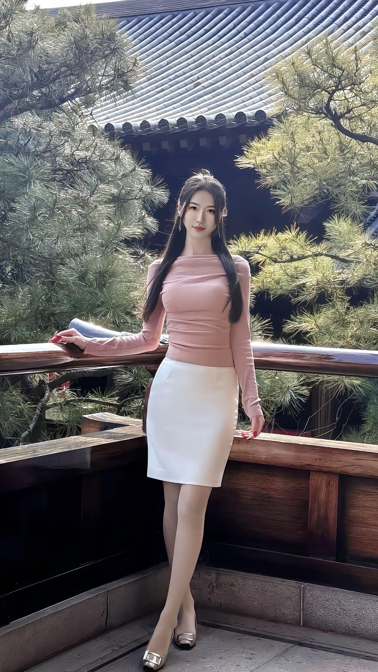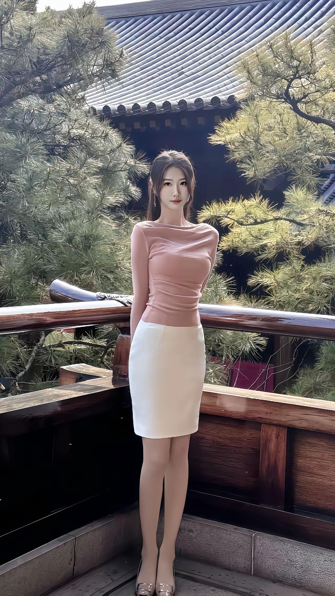 青松掩映下,佳人倚栏立。