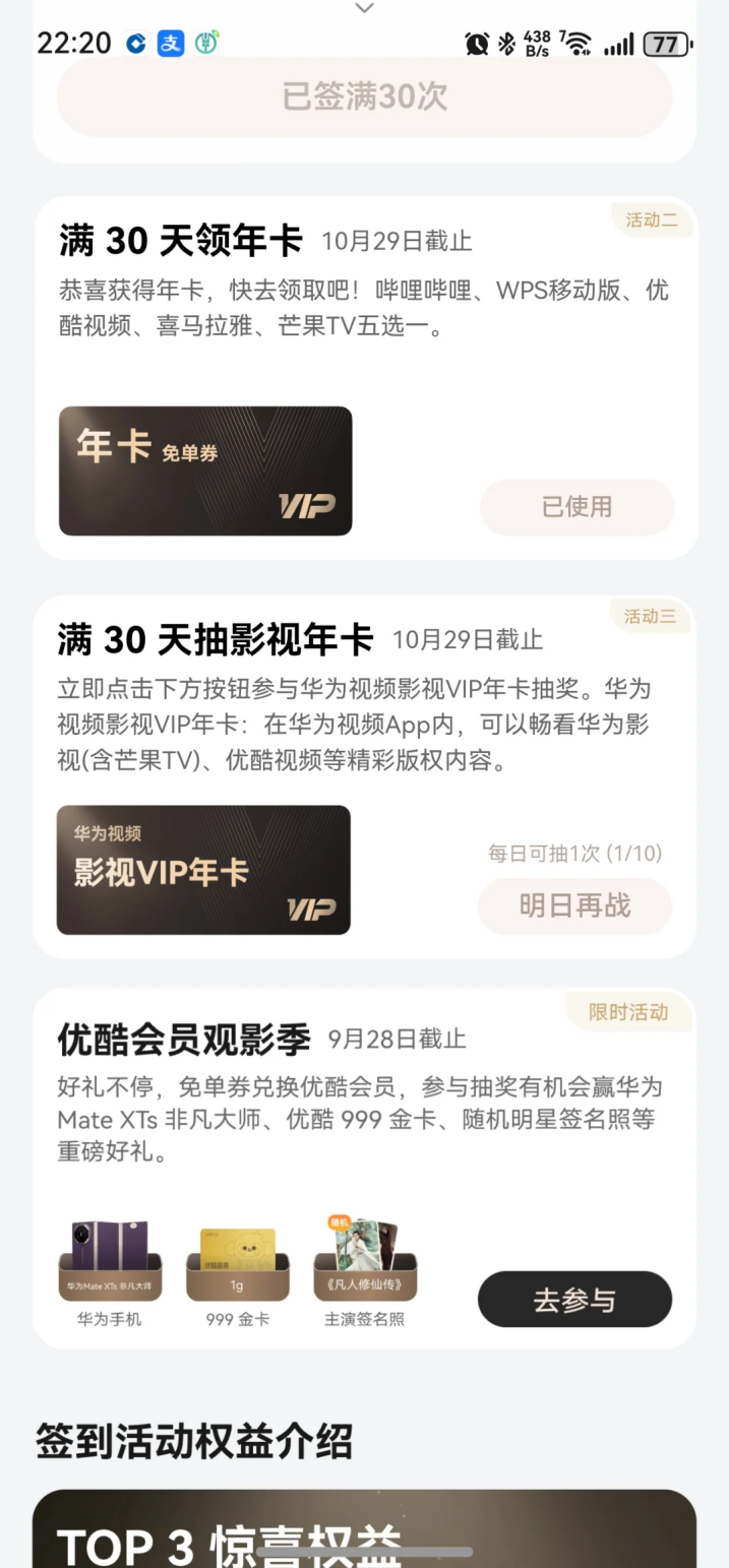 而这还只是开胃菜。华为好像听到了我们这些影视迷的心声,“鸿蒙有礼”还升级了福利!只要在首签后第30天起,即可参与“影视年卡”的抽奖活动。每天都能抽一次(最多10次),奖品是华为视频影视VIP年卡!