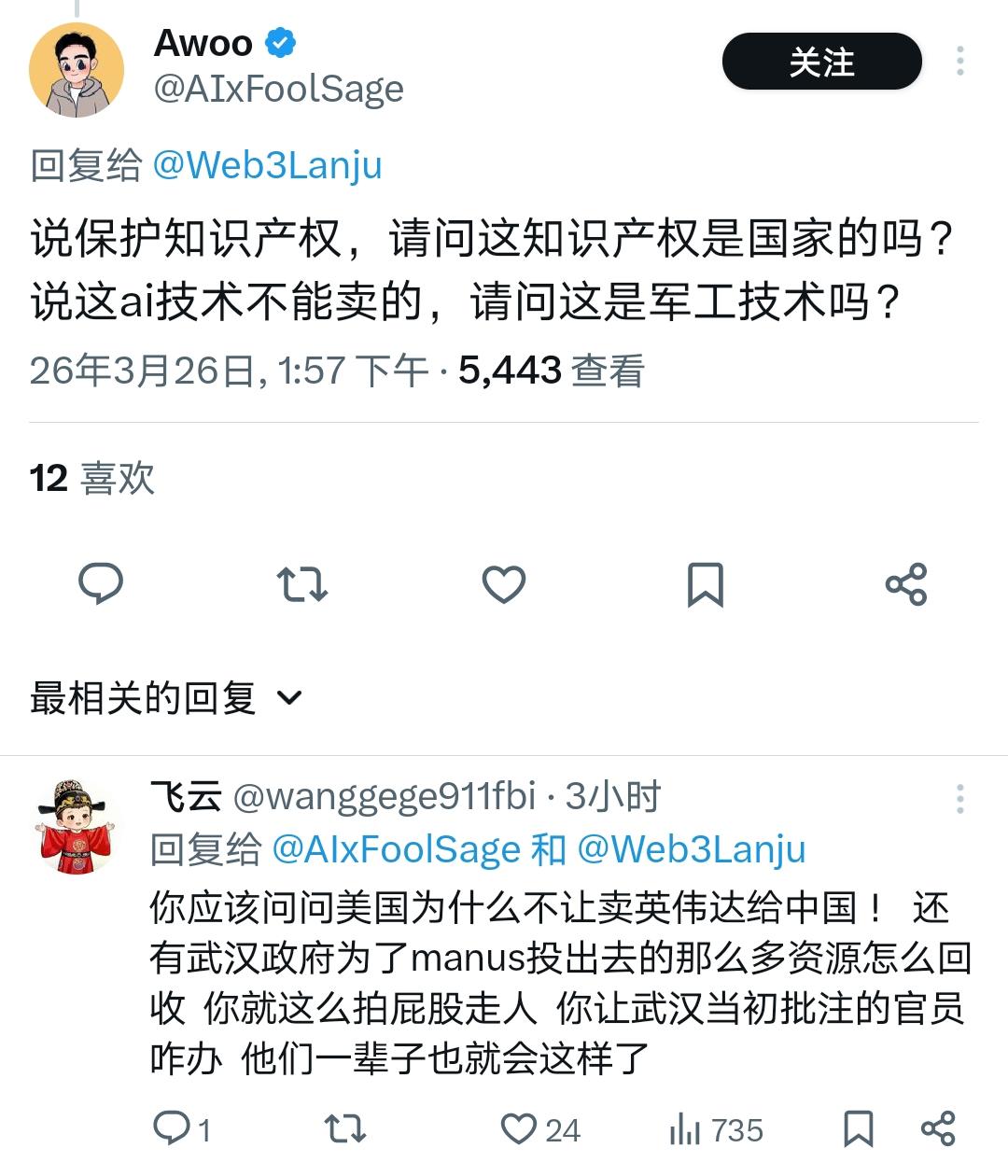 Manus 为什么不能卖给 Meta? 如果还有人问这个问题,这位网友的回答可以参考。 其实,我国这些年陆续出台的《反外国制裁法》《中国禁止出口限制出口技术目录》《数据安全法》等一系列法规,全都管得着 Manus:既然拿过公共资源,就不是你想卖就能卖的。 反观美国,以政治借口限制技术出口的法律更多,比如 ECRA《2018 年出口管制改革法》、《国际紧急经济权力法》(IEEPA)、《出口管理条例》(EAR)…… 还有不少更是典型的 “先射箭再画靶”,比如大家耳熟能详、臭名昭著的《芯片与科学法案》,也就是 CHIPS Act。 所以,咱就别替友邦惊诧了! Source: X