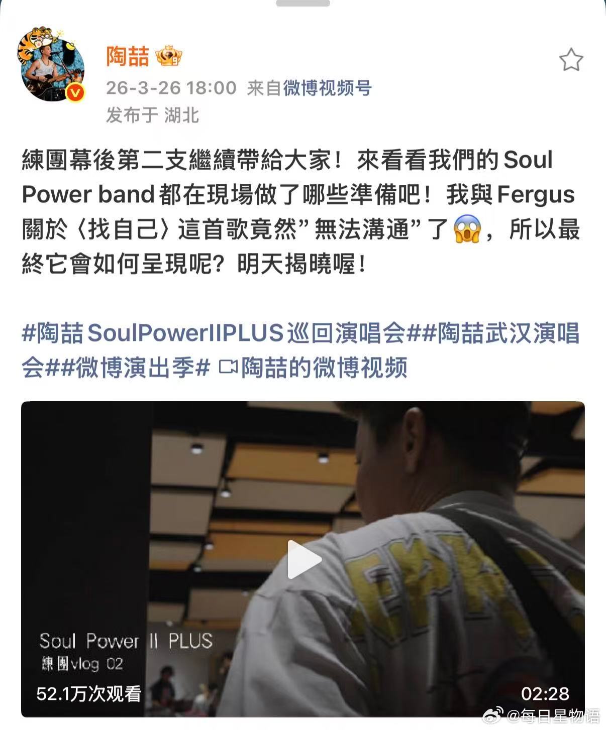 陶喆剧透巡演新歌 新巡演Soul Power II PLUS排练vlog今日两连更!里面剧透了管弦乐升级编曲,隐藏新歌也被大家火眼金睛猜出来了,明晚武汉要炸了现场见!