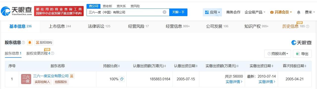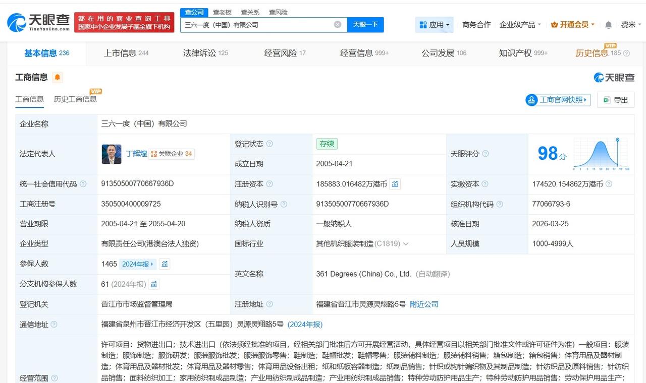 三六一度中国公司增资至约18.6亿港元 天眼查App显示,近日,三六一度(中国)有限公司发生工商变更,注册资本由约17.5亿港元增至约18.6亿港元。 该公司成立于2005年4月,法定代表人为丁辉煌,经营范围包括服装制造、鞋制造、体育用品及器材制造等,由三六一度实业有限公司全资持股。 天眼查信息: