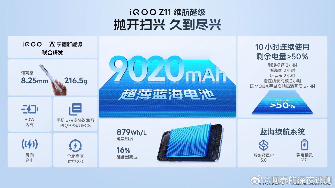 续航更是非常顶, 爱酷史上最大的 9020mAh 超薄蓝海电池,采用与宁德新能源联合研发,具备硅含量高达 16% 的全新第四代硅负极,以及能够实现低温持久续航的全新第二代半固态技术,能量密度突破 879Wh/L,同时还配备 90W 超快闪充,支持 55W PD/PPS 协议和 44W UFCS 协议的快充输入。