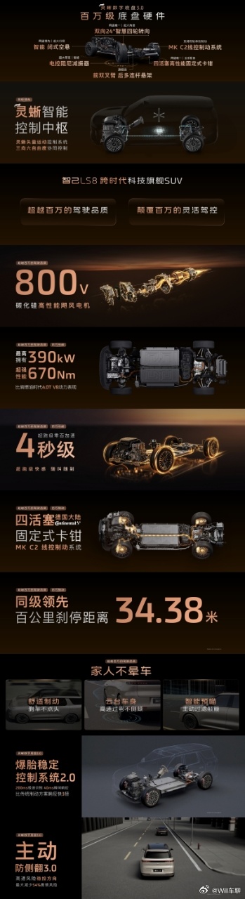 灵蜥数字底盘 3.0,全系标配双向 24° 智慧四轮转向,5 米大车转弯半径仅 4.85 米。全线控技术 20 毫秒极速响应,比传统转向快 4 倍,前双叉臂 + 空悬 + CDC 减振器,百公里刹停仅 34.38 米。