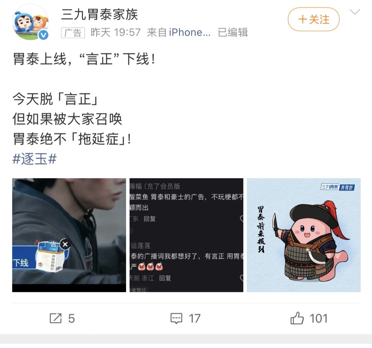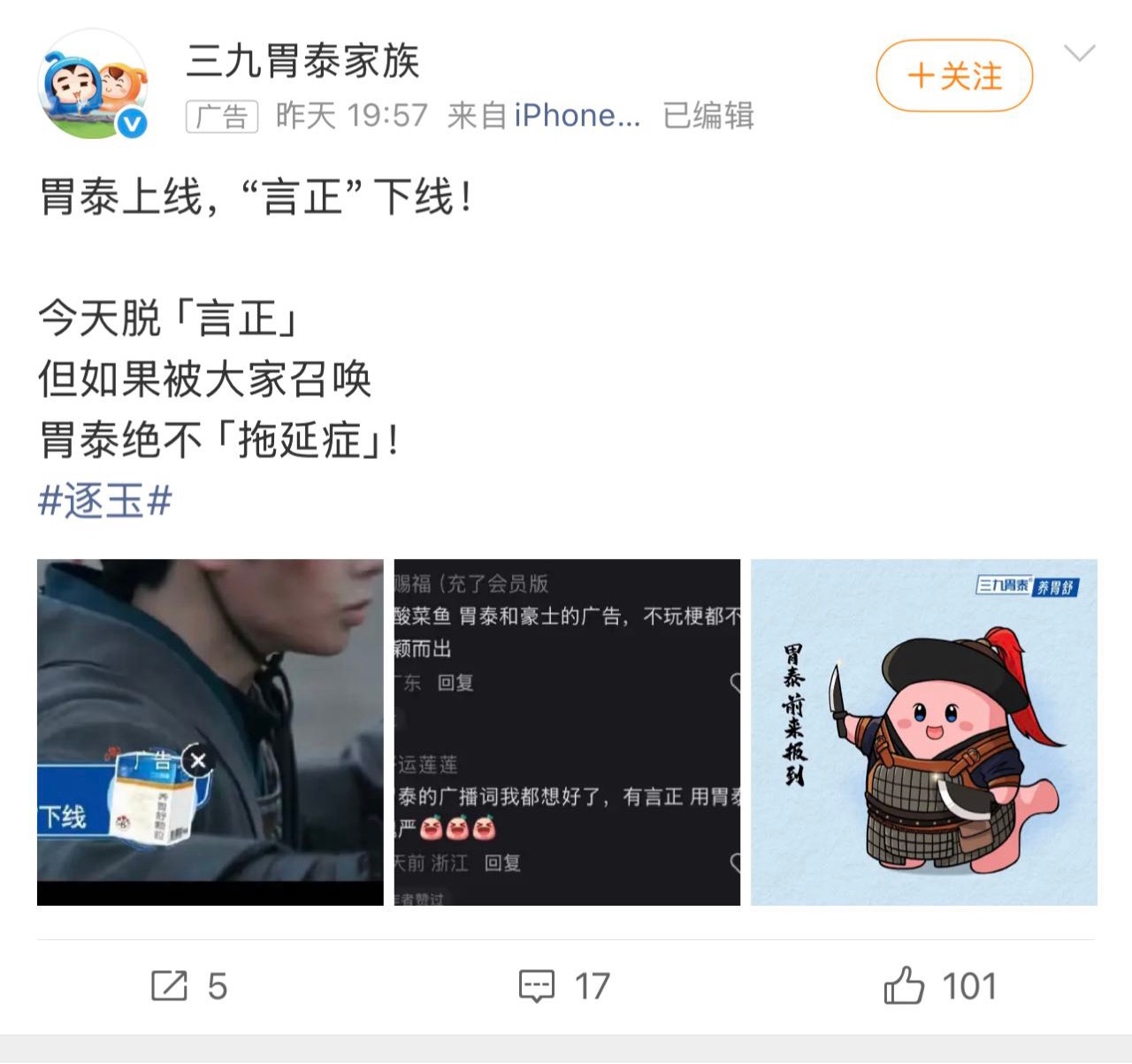 逐玉最好的售后各位姐妹们,真是笑不活了,活久见了属于是,谁家品牌比剧粉还会磕呀?三九胃泰,你真的是会懂整活这件事情的~从言正到魏严,从惜胃到治“魏”抗“严”,谐音梗玩得飞起,贴片也全是活人味儿,剧粉提要求是真听啊,这网感不去做宣发真可惜了!逐玉大结局