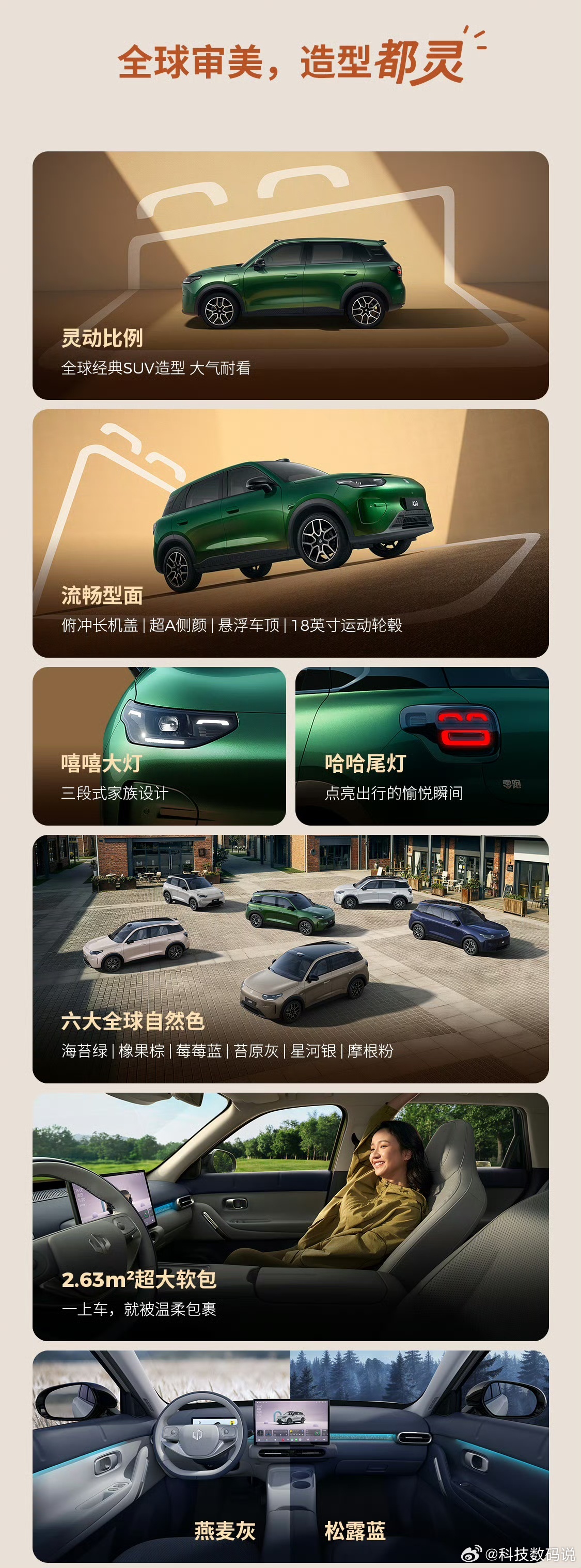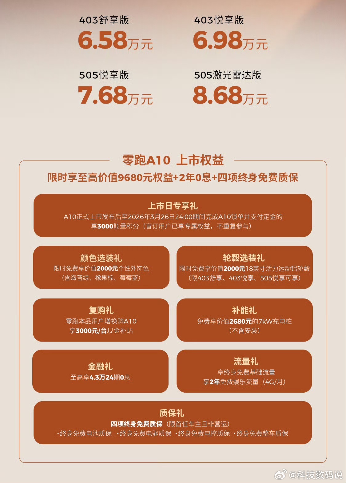 零跑又一款精致小车来了,零跑A10正式上市,推出4个版本,403舒享版6.58万元、403悦享版6.98万元、505悦享版7.68万元、505激光雷达版8.68万元。顶配不到9万元,真的有点香!设计上采用经典SUV造型,提供6种车色选择,内饰提供2种配色,配备了三挡加热的云感舒享座椅另有主驾靠背小桌板、256色氛围灯、全景天幕等配置。智能性上搭载了激光雷达,支持车位到车位辅助驾驶,车机使用了高通8295芯片以及千问大模型,提供403km和505km两种续航版本。