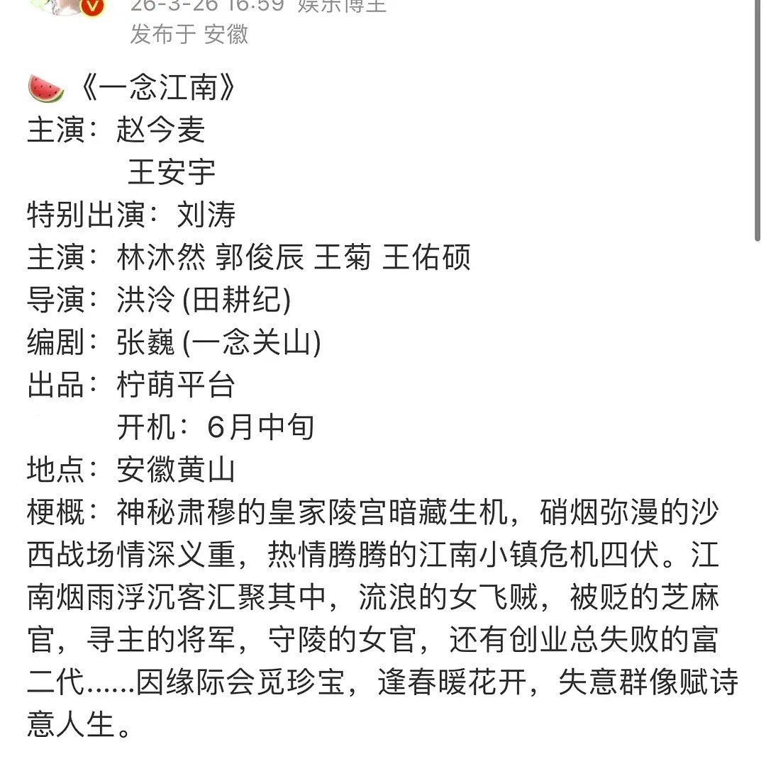🍉🍉《一念江南》女主换赵今麦,男主还是王安宇。 等俩人新戏杀青,预计6月开机