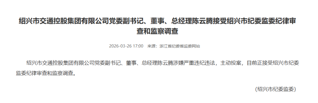 绍兴市交通控股集团有限公司党委副书记、董事、总经理陈云腾涉嫌严重违纪违法,主动投案,目前正接受绍兴市纪委监委纪律审查和监察调查。