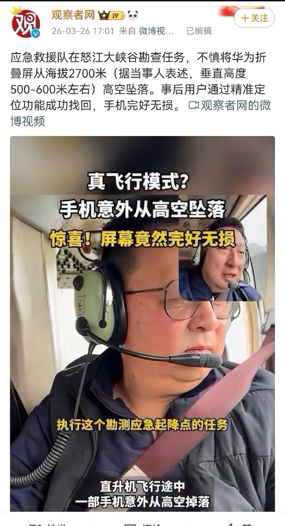 华为折叠屏这夸张的质量和防摔能力,救援队勘察任务时不慎将其从高空坠落(500-600米垂直高度),不仅通过定位功能成功找回,关键手机还完好无损。