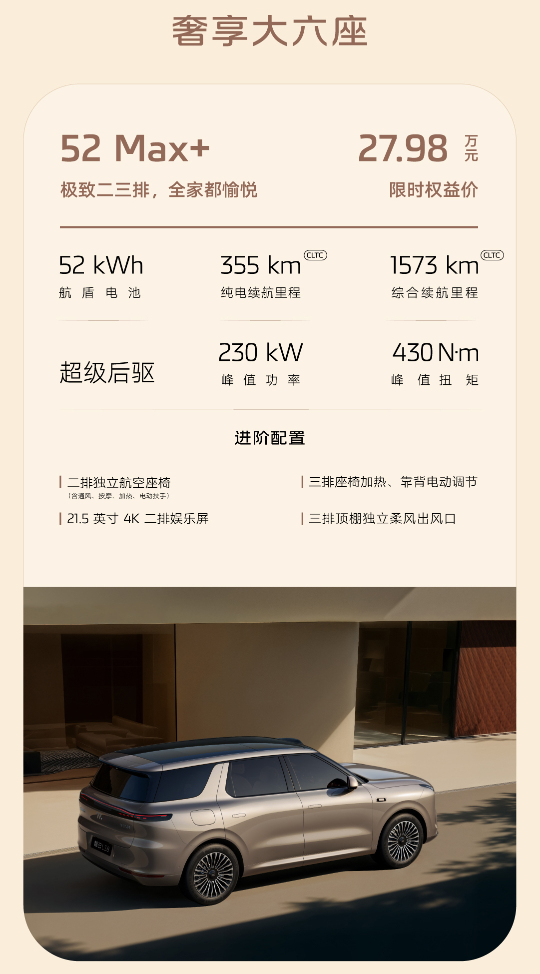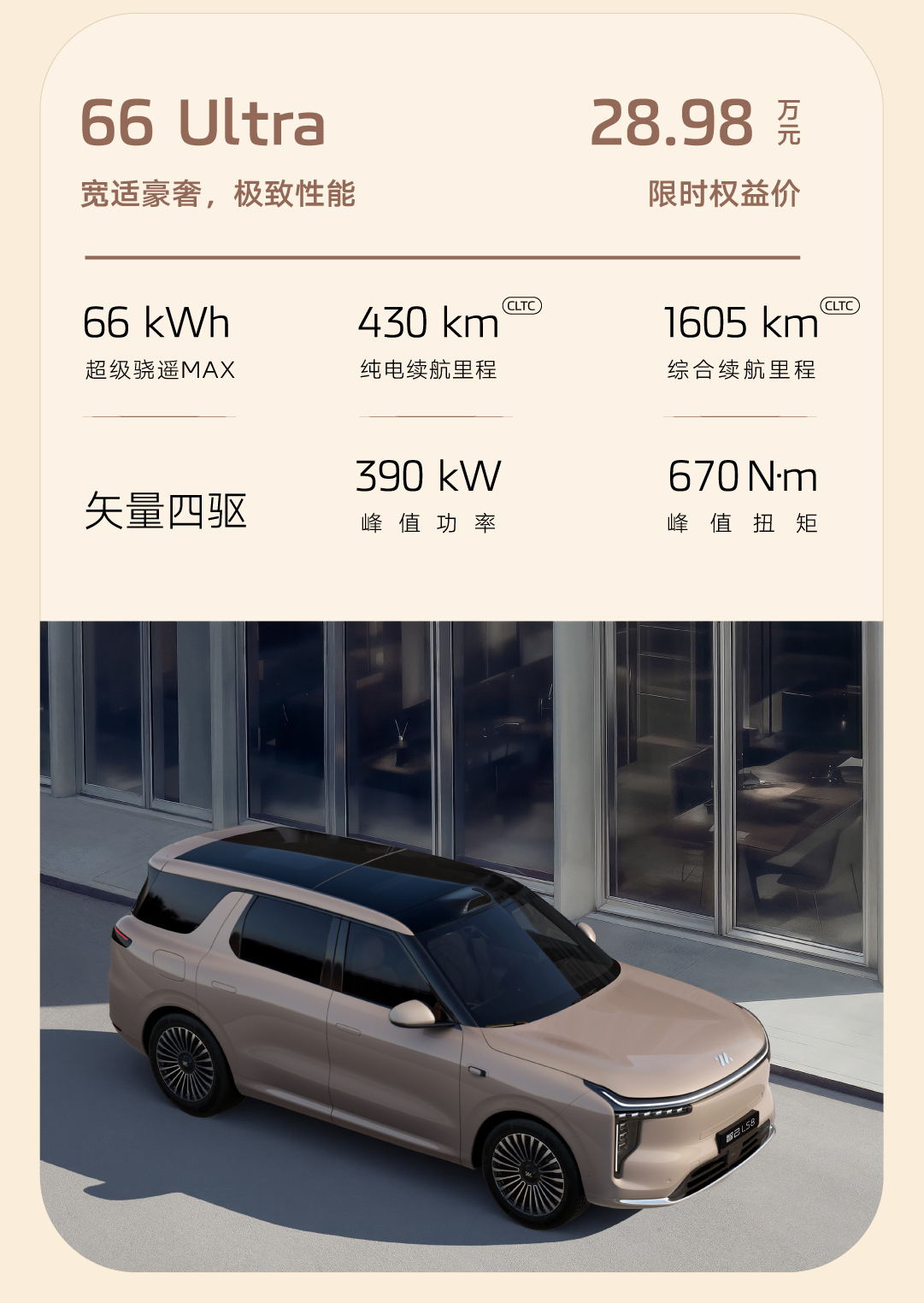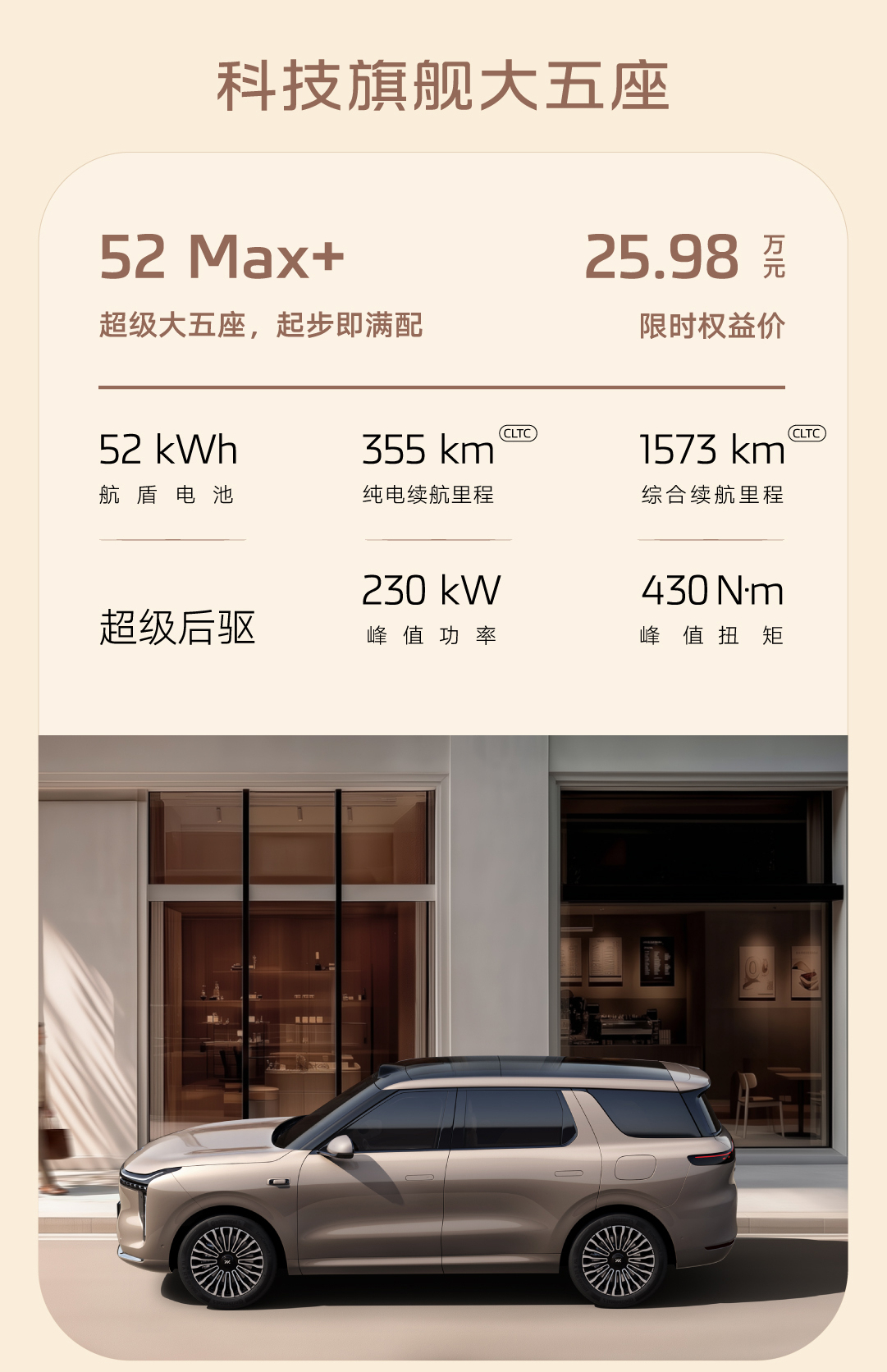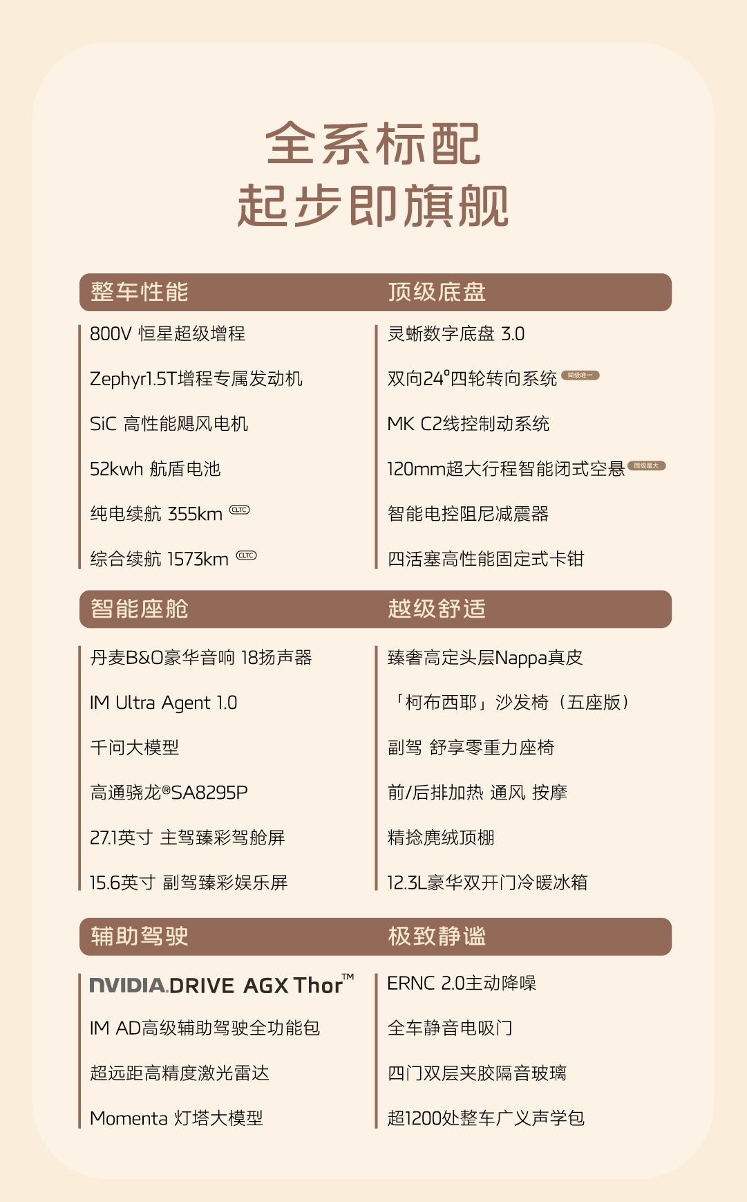 车长5米轴距3米,标配800V增程、全线控转向、空悬、后轮转向、BO音响、电吸门、激光雷达、高阶辅助驾驶…