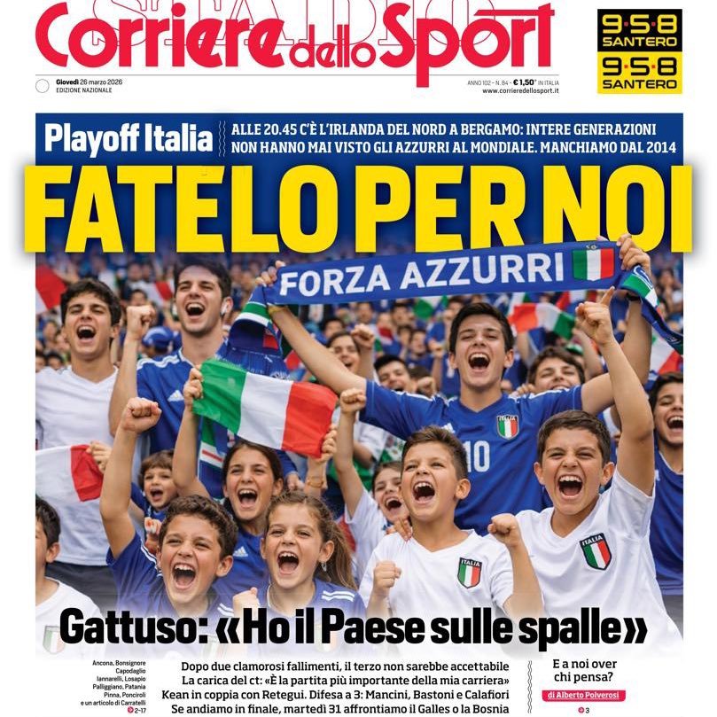 意大利vs北爱尔兰的世界杯附加赛,对于蓝衣军团的意义不言而喻。今天报纸的标题:为那些从没有看过意大利踢世界杯的孩子们而战!如今16岁以下的意大利小孩,都没有亲眼见证过自己球队的世界杯