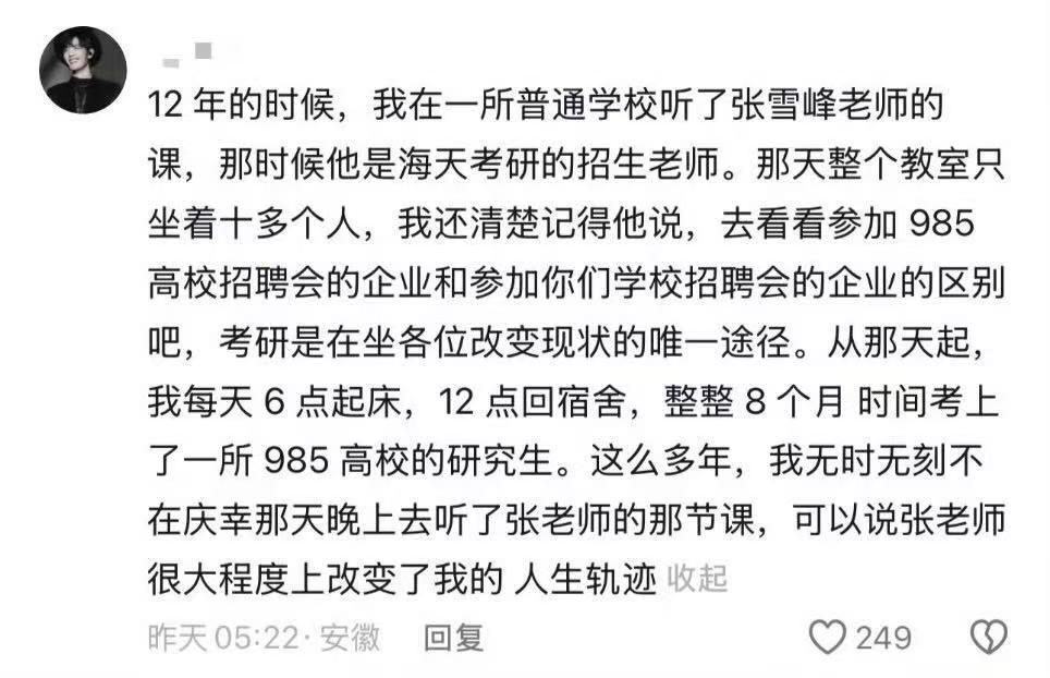 看哭!资助生写悼念信给张雪峰! 这是一封看哭很多人的信,信中的女孩是张雪峰在暖风助学金里的第一批受助学生,曾经她以为自己未来有很多机会可以亲自去感谢张雪峰,却没想到全部成了遗憾。所以想见什么人就马上去见,想说什么话就赶紧说,千万不要因为错过而后悔。 张雪峰的家属已经发了通知说不要送花,无奈大家唯一能做的就是送一束花,写一封信去感恩。也有网友是通过网络写悼念信的,无论哪一种形式,手写的都是最感人的。