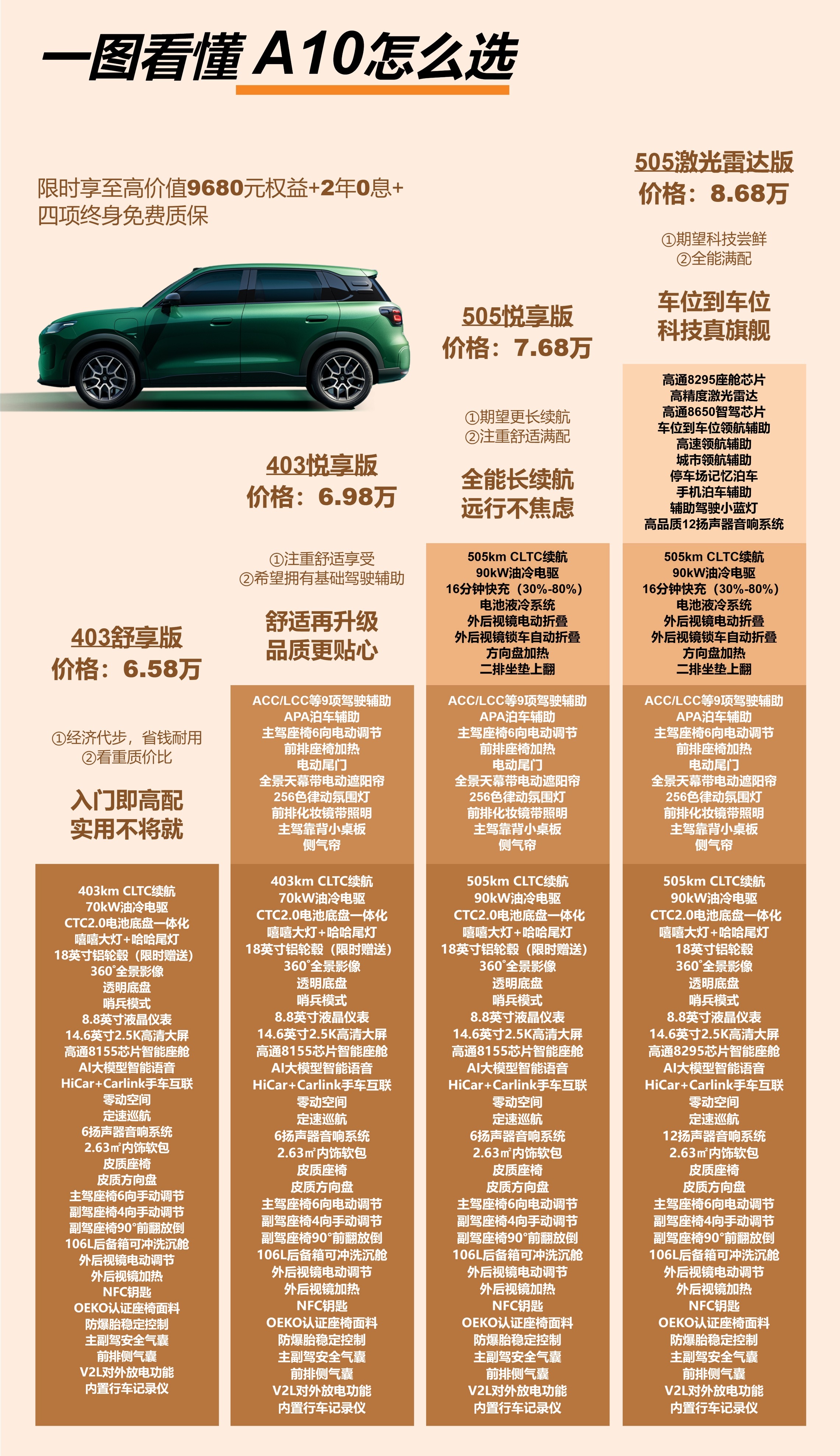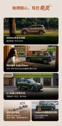 ✅ 超长续航:提供403km/505km两种CLTC续航版本,505km版本油冷电驱,30%-80%补能仅需16分钟,长途也不焦虑。