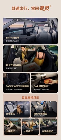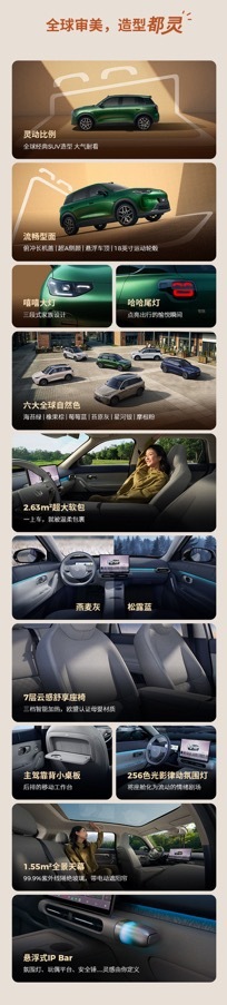 除此之外,科技自然美学2.0设计,家族化三段式“嘻嘻/哈哈”情绪灯组,海苔绿、橡果棕、莓莓蓝等6大自然灵感车色,颜值拉满!1.55㎡超大全景天幕隔绝99.9%紫外线,2.63㎡座舱软包覆盖,悬浮式IP Bar支持DIY定制,细节感满满!