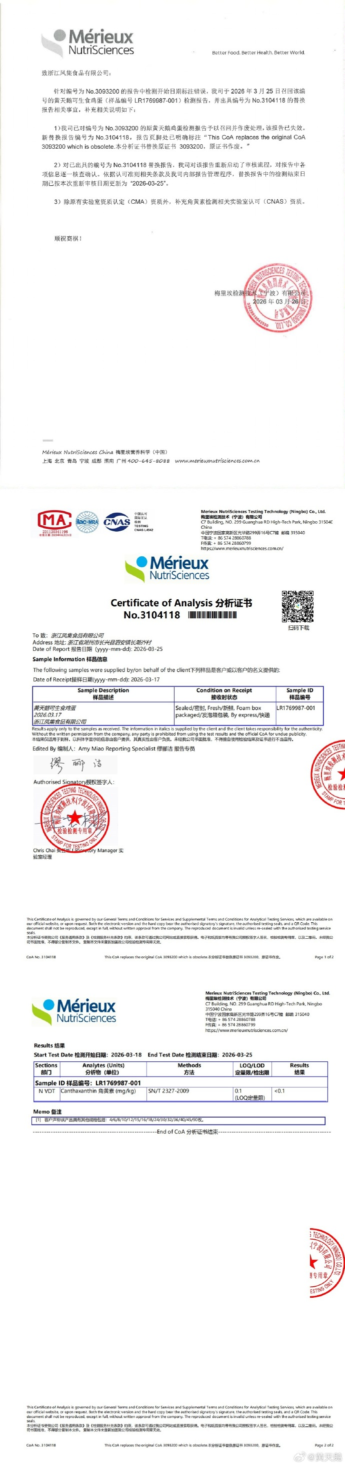 有细心网友发现,我司发布的由梅里埃检测技术(宁波)有限公司出具的No.3093200分析证书显示“检测开始日期为2027年3月18日”。我们第一时间联系该检测机构,经核实,系该机构实验室在编辑分析证书时标注错误,正确检测开始日期为“2026年3月18日”,更正后的分析证书编号为No.3104118,故原分析证书作废(具体见下方该机构的相关说明和分析证书)。感谢大家的关注,由此造成的疑惑,我们致以诚挚的歉意。