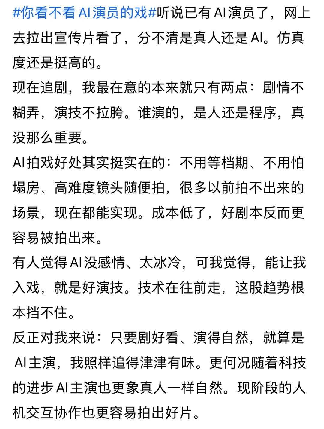 潮新闻记者在客户端潮圈频道中也发起了相关讨论:#你看不看AI演员的戏#。