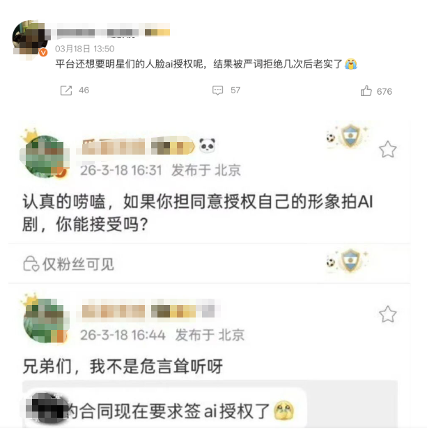 在大家呼吁翟子路维权时,当天,@还能抵挡一些霹雳、@瓜界顶流等营销号爆料,平台想要明星的人脸AI授权,遭到了明星拒绝。
