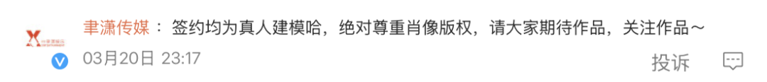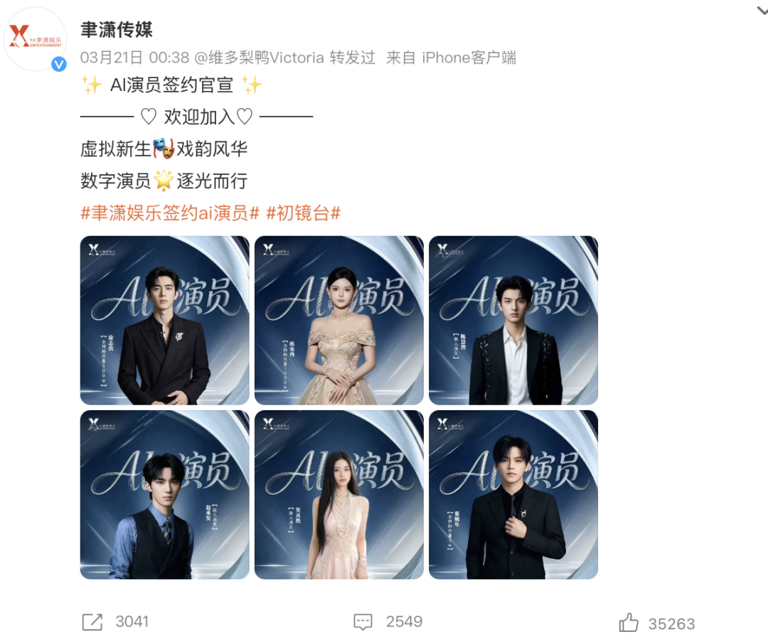 3月21日凌晨,聿潇传媒官宣了六名AI演员,均为真人建模。