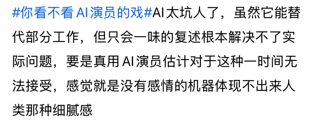 但大多数读者表示,不想看AI演戏,太假了,“没有感情的机器体现不出人类的细腻感”,“只有血有肉的人演戏才有真情实感,才会让观众代入”。