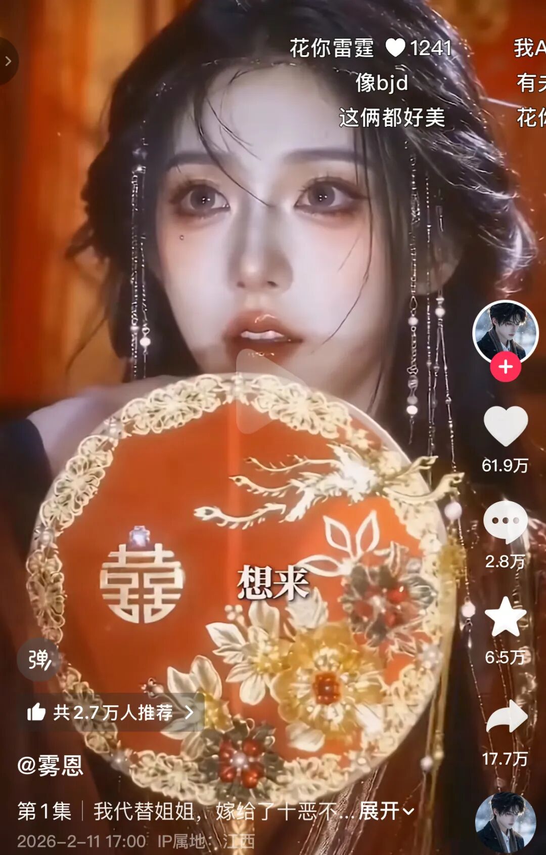 2月11日,雾恩在网上发布了一条45秒的AI短剧视频,点赞高达61.9w,评论区不少网友表示,“这才应该是《成何体统》男女主的样子”,“好伟大的建模,这氛围感,支持AI取代短剧”。