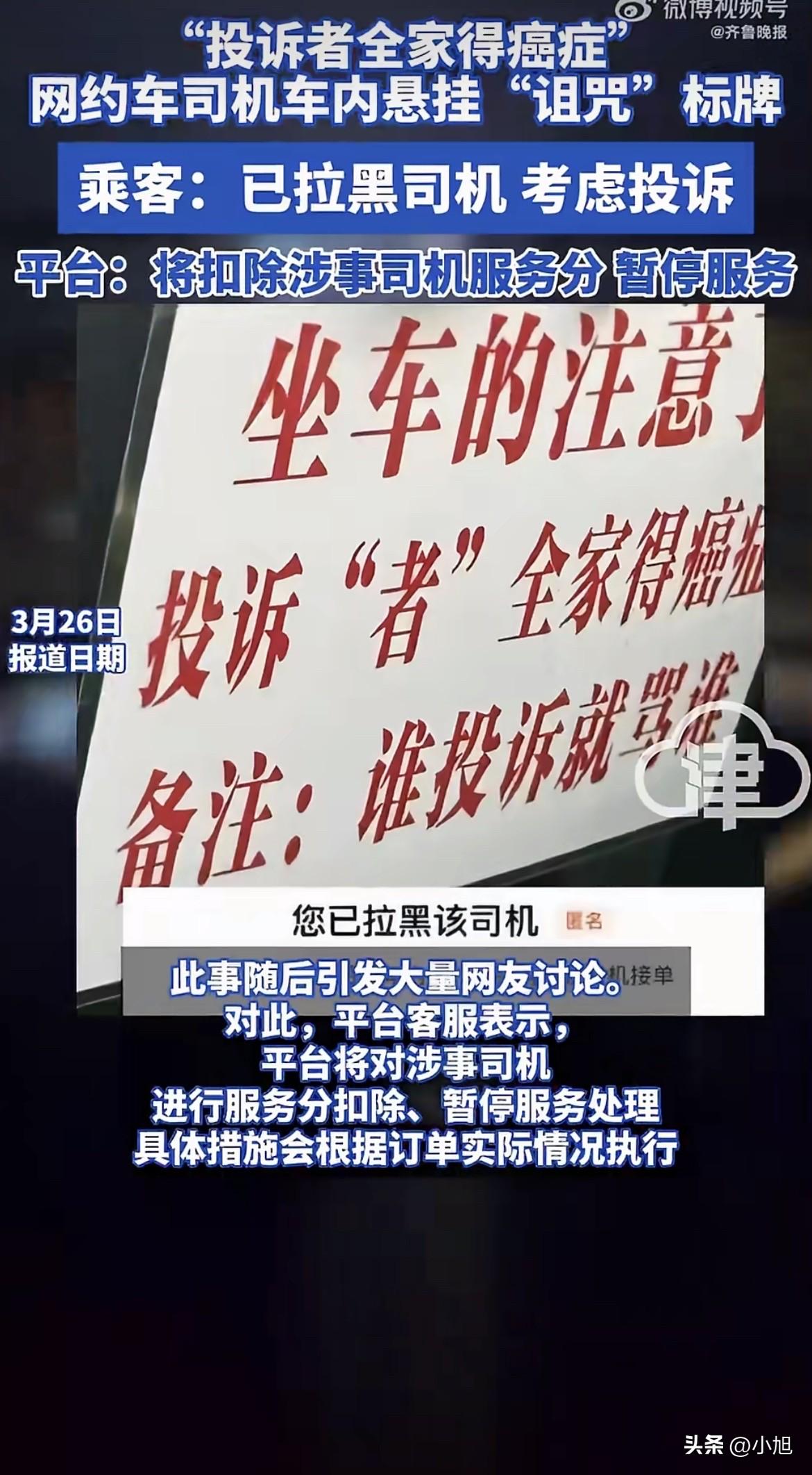 3月26日,广东一个网友打网约车,拉开车门坐进去,抬头一看,后视镜上挂着一块牌子。 牌子上的字,看得人心里发毛。“坐车的注意了,投诉‘者’全家得癌症”,底下还有一行备注:“谁投诉就骂谁”。 就这么明晃晃地挂着,诅咒每一个可能投诉的乘客。 这位乘客后来在网上发帖说,自己用这个打车软件快十年了,头一回遇到这种事。当时心里肯定不舒服,但赶着坐高铁,没时间跟司机掰扯,硬着头皮坐了一路。 下车之后,他做的第一件事就是拉黑这个司机,说正在考虑投诉。 这事儿发到网上,评论区直接炸了锅。 很多人想不通,这司机到底图啥?是之前被投诉扣了钱,心里憋着火?还是想用这种方式吓唬乘客,让所有人都不敢给差评? 但仔细想想,这逻辑根本说不通。 车里挂这么个牌子,乘客一上车就看见了,这一路得多糟心?本来服务没问题,乘客可能还给个好评。这下好了,甭管车开得怎么样,下车第一件事就是拉黑。 这不是防投诉,这是主动给自己招投诉。 更让人膈应的是那个“备注”。说句不好听的,投诉是平台给的权利,也是约束司机服务的一种方式。要是谁投诉就骂谁,这哪是提供服务,这是给乘客立规矩呢。 记者联系了平台客服,对方的回应倒也干脆:核实之后,扣服务分、暂停服务。 但这个处理结果,很多人觉得轻了。扣分、停几天,风头过了换个地方接着跑,真能长记性吗? 有网友扒出来,这种“威胁式车贴”还不是个例。有人晒出照片,有的司机贴纸条写着“轻手关门、禁止饮食”,最后加一句“本人一身债务、逾期、黑户,无视一切后果”。 翻译过来就是:别惹我,我光脚的还怕你穿鞋的? 乘客坐个车,还得先掂量掂量司机的心理状态,生怕哪句话不对付惹出事来。 说实话,跑网约车确实不容易,平台抽成高,碰上难缠的乘客也窝火。但这不是把气撒在普通乘客身上的理由。 一块诅咒牌子,表面上是骂那些投诉的人,实际上把所有坐车的人都捎带上了。乘客花钱坐车,没招谁没惹谁,一上车就被诅咒全家得癌症,这叫什么事? 现在这位乘客已经拉黑了司机,正在考虑要不要正式投诉。 如果是你,上车看到这么一块牌子,你会直接下车换一辆,还是忍一路?