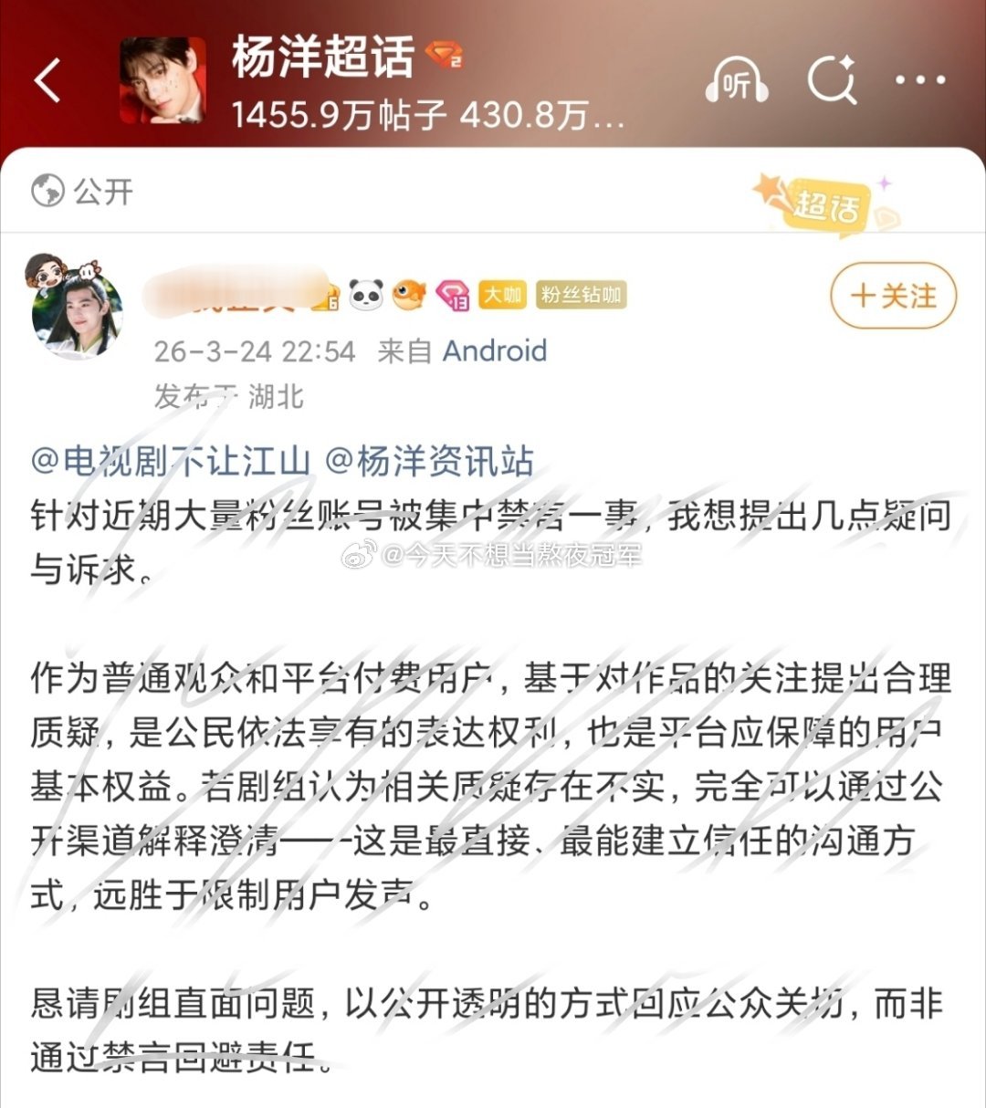 窝趣,对《不让江山》剧组提出抗议的一大批杨洋粉丝被🈲言了半年
