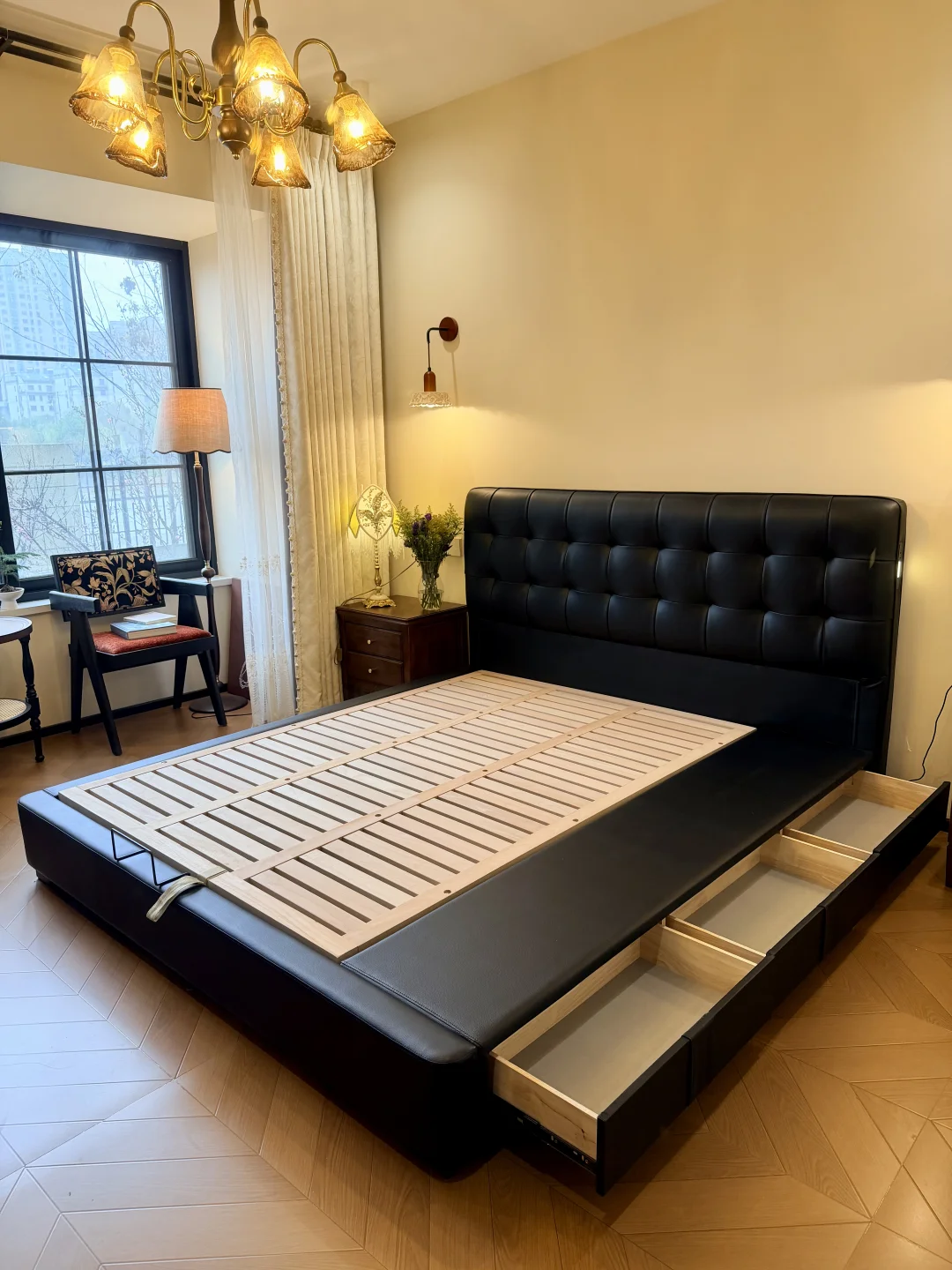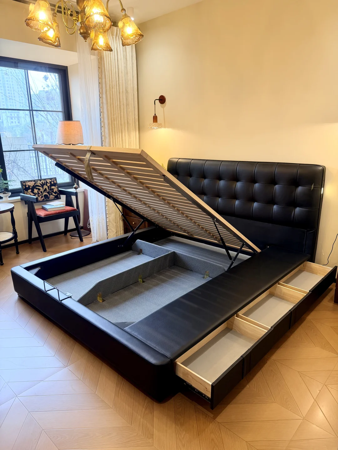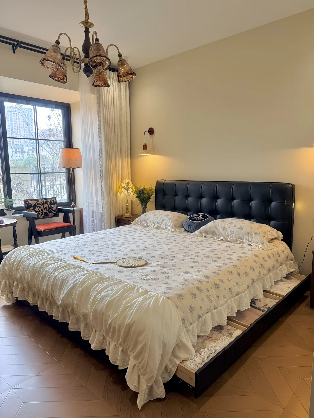 ~ 哈喽姐妹们 欢迎云参观我在一楼的复古小卧室呀 卧室空间不大,但是也想整的舒服又漂亮 这可花了我不少的心思呢~ 因为想要在软装上有更多的发挥空间 所以硬装简简单单 没有吊顶也没有贴石膏线 双层的复古窗帘为小卧室的温馨打下了基础的格调 窗户是我喜欢的大格子窗 透气采光都很好 安排了一组桌椅,整个空间更加灵动 卧室里的每一盏灯都点缀的恰到好处 让我的小房间变得更加浪漫有氛围 卧室空间有限 没有打衣柜而是在床尾放了斗柜梳妆台 还有我精细挑选的佐尔适华夫格储物床 它外表看起来高级又大气 和我的复古小卧室也很搭 头层黑牛皮的软靠包既舒服又好打理 床头还自带柔光小夜灯和USB接口 起夜也不怕摸黑,玩手机充电也不用到处找插座了 简直是不要太方便~ 齐边设计也很懂小户型 悄悄省出超多卧室空间 小小的卧室也变得更加宽敞 床底和床侧都拥有收纳功能 一些换季不需要的物品都可以放在床底框架箱子内 抓住提拉带子一拉,气压杆就可以托起 女生拿取也会很方便 侧边就是更方便拿取的小抽屉 足足有三个,除了放我经常更换的四件套 纸巾也可以随时拿取,再也不用摆放在外面看着乱七八糟的啦 加密的排骨架肉眼可见的扎实,承托力在线 这么一款美貌又实用的佐尔适华夫格储物床 简直是为我量身定制 对于没有在卧室打柜子的我实在是太刚需啦! 卧室虽小,却也在我的不断完善中变的更加契合我的心意 睡在这里的每一天都感觉生活真的太幸福啦~ 卧室装修佐尔适华夫格储物床佐尔适储物床卧室床推荐真皮床14平小卧室小户型卧室复古卧室卧室收纳梦中情卧卧室好物