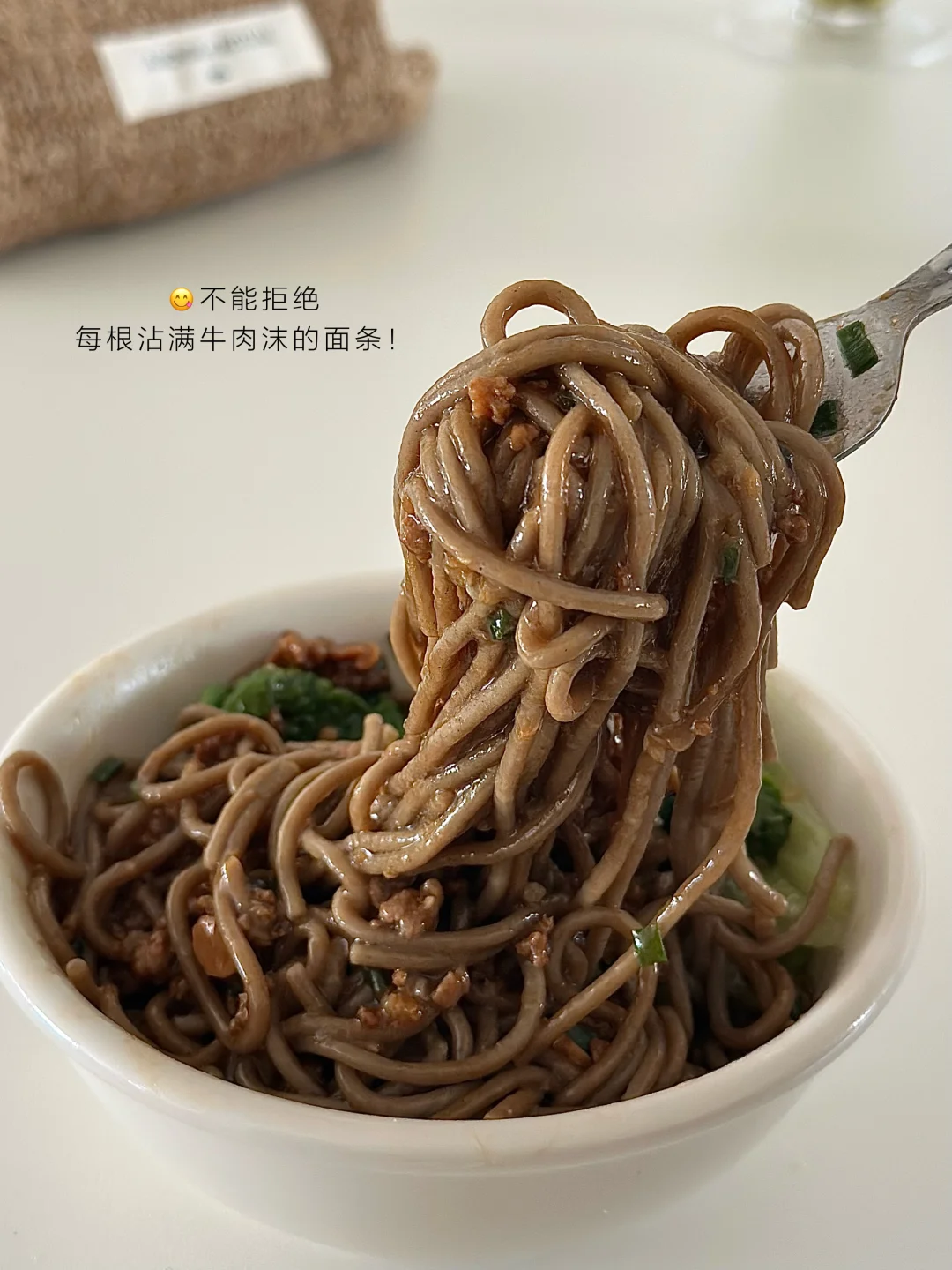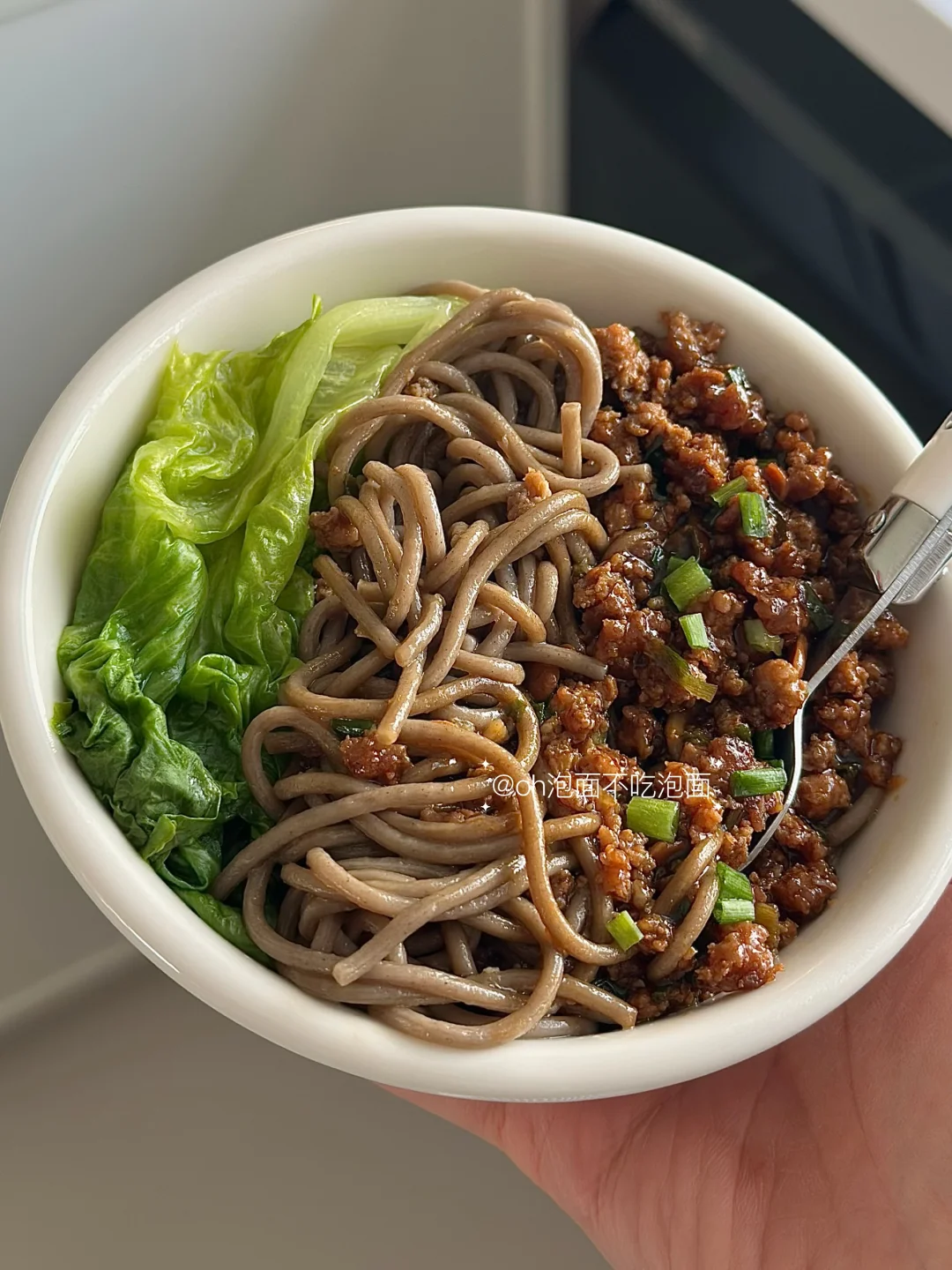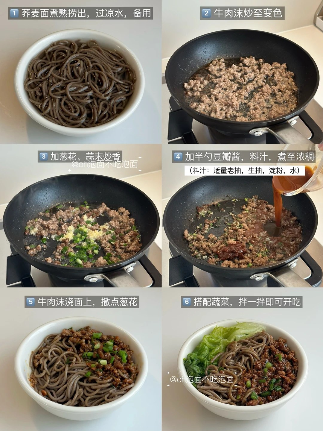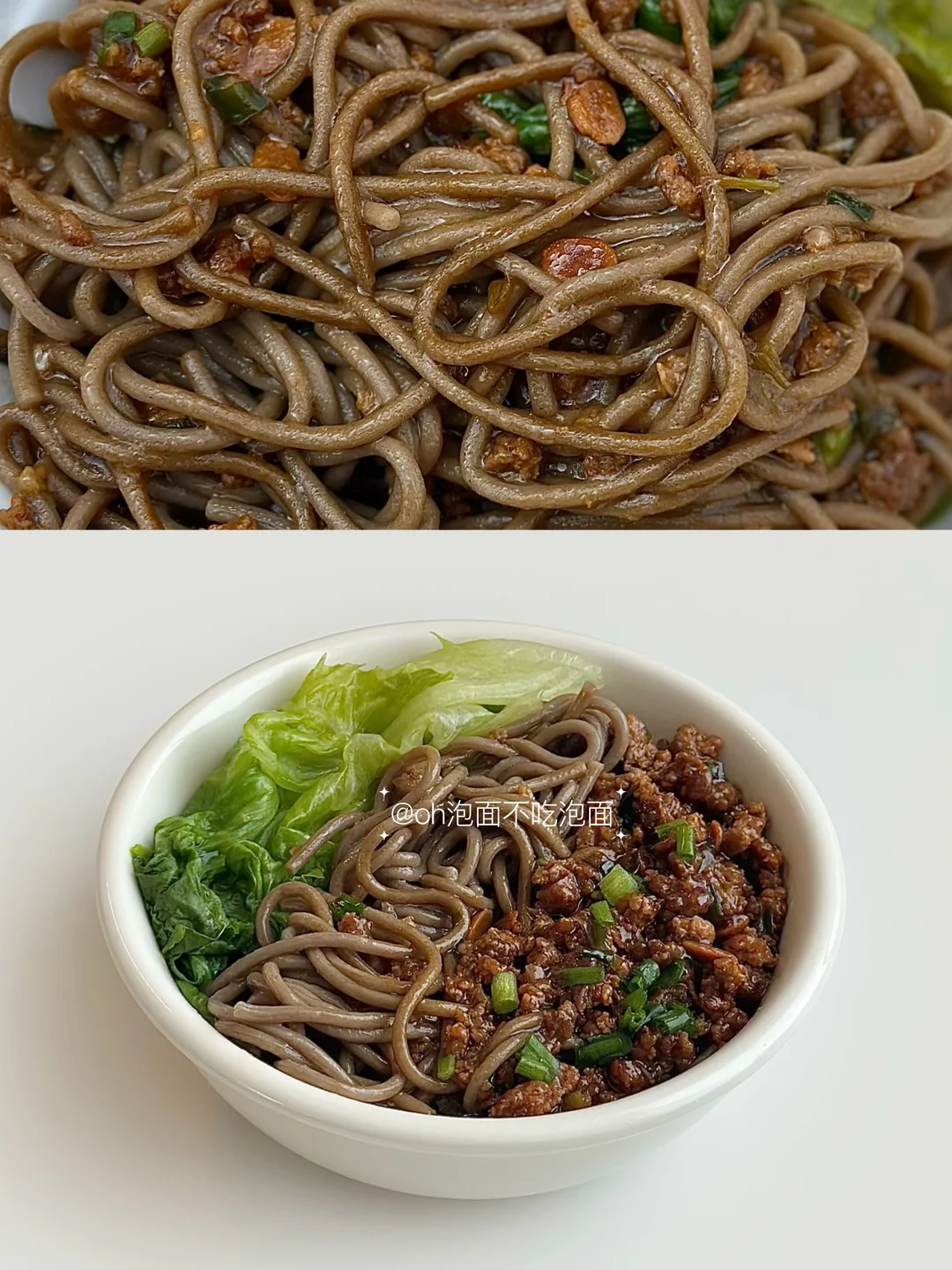 😋附步骤,飘香拌面,每根面条蘸上牛肉酱汁的香谁懂!好吃好吃! 🍝食材:牛肉沫,荞麦面,生菜,料汁:适量生抽、老抽、淀粉,清水) 🥣步骤: 1. 荞麦面煮熟,捞出过凉水,备用 2. 牛肉沫炒至变色 3. 加葱花、蒜末继续炒香 4. 加豆瓣酱、料汁,煮至浓稠 5. 煮熟的牛肉沫浇荞麦面上 6. 搭配蔬菜,拌一拌即可