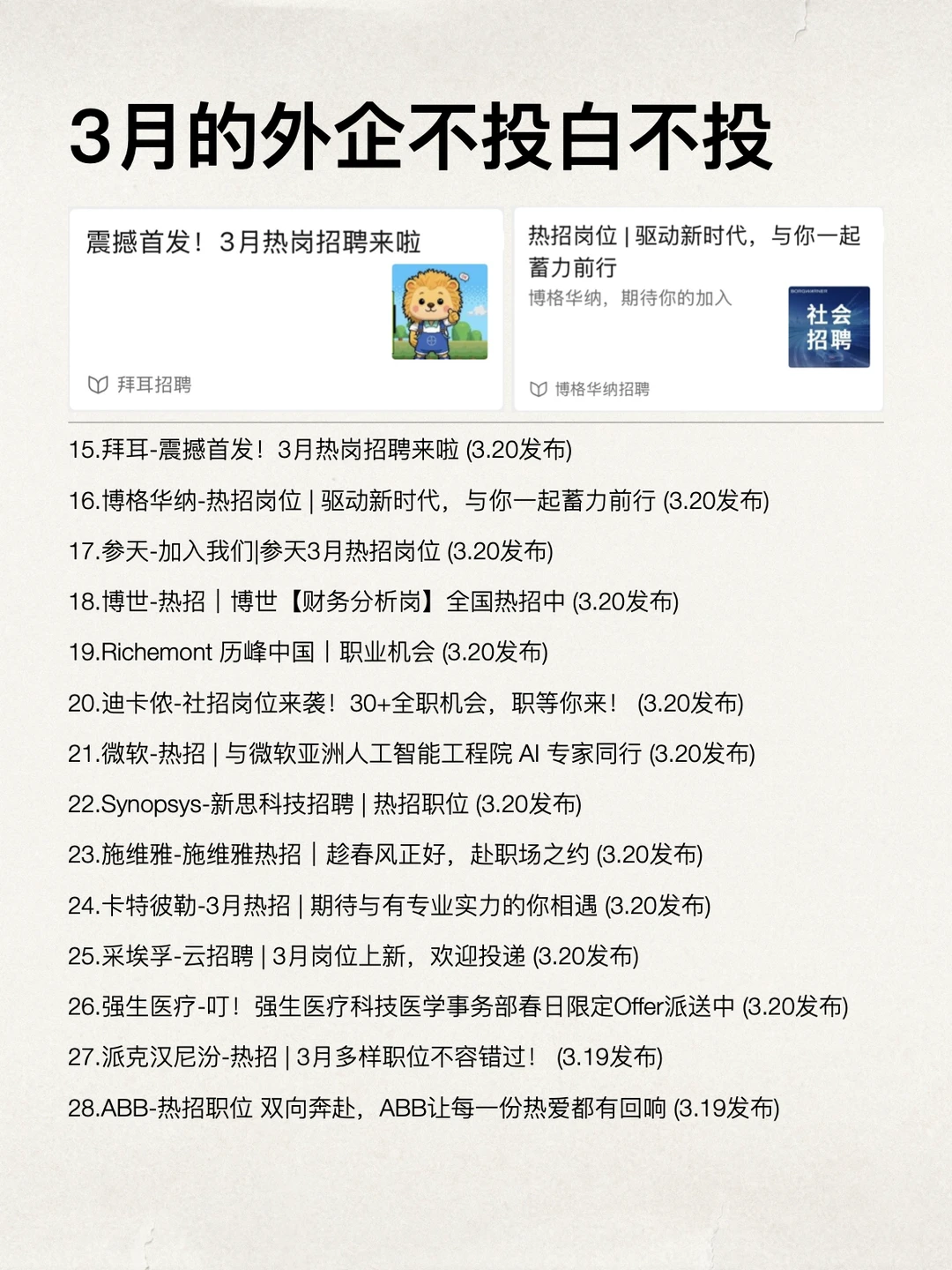 3 月不投外企真的有点可惜,位更新得太快了,而且很多很快就推进面试流程了,反馈节奏也比平时更快一点 更关键的是,外企的整体待遇确实好,双休不卷,年假起步就不低,10天起,还有各种关怀补贴这些,待着真的很舒服 同时对女性也更友好,很多公司也有培训体系或内部发展路径,长期来看更可持续。图上把最近在招的一批外企整理好了,可以趁现在多投一下 坚持日更✊🏻,对外企感兴趣的欢迎常来看看