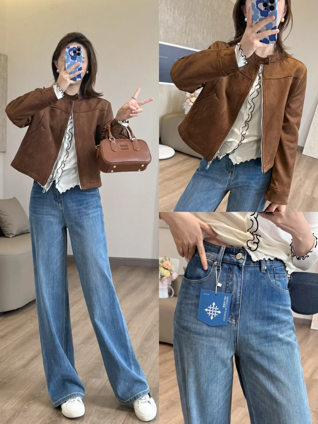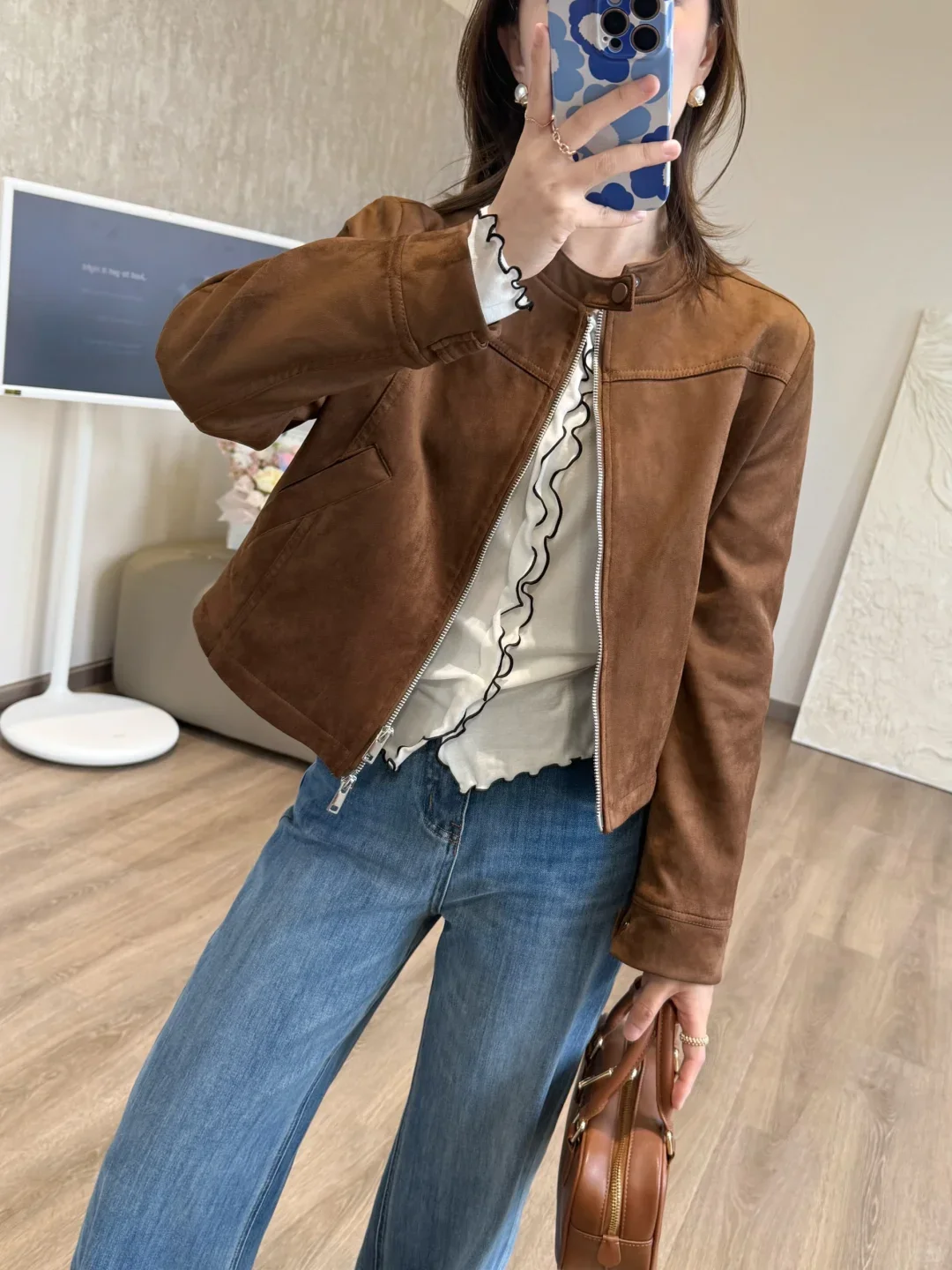 怎么会有这么好看的外套!牛仔裤➕小白鞋 好显高显瘦 巨显腿长!!随性慵懒的气质~ 158小个子穿搭 梨形身材穿搭 春夏穿搭 棕色系穿搭 麂皮外套 夹克外套 时髦穿搭 牛仔裤穿搭 显瘦显腿长 通勤穿搭