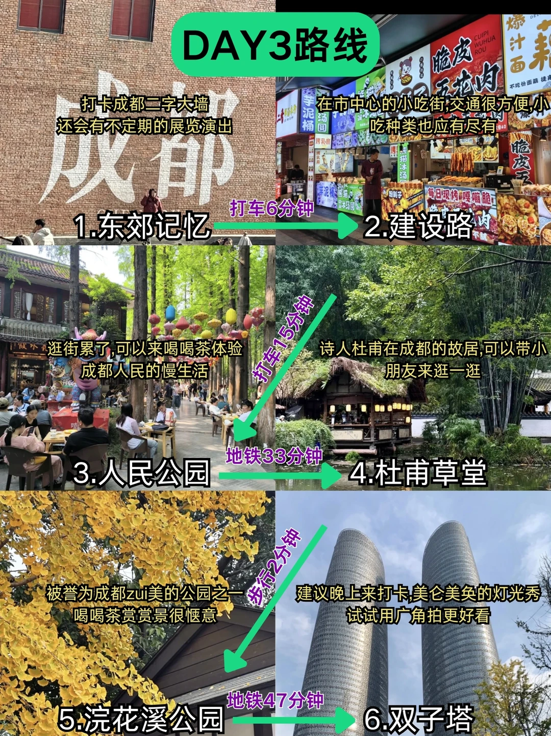 Day:东郊记忆→建设路→人民公园→杜甫草堂→浣花溪公园→双子塔