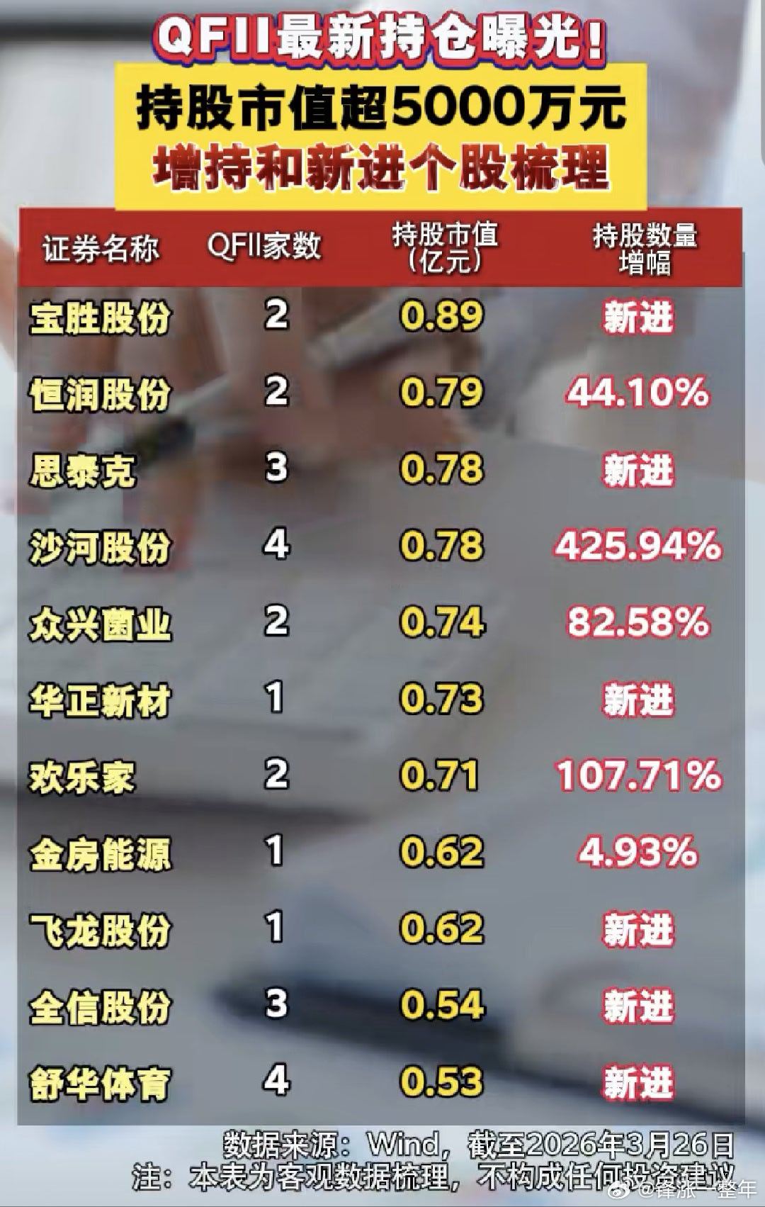 QFII最新持仓情况A股
